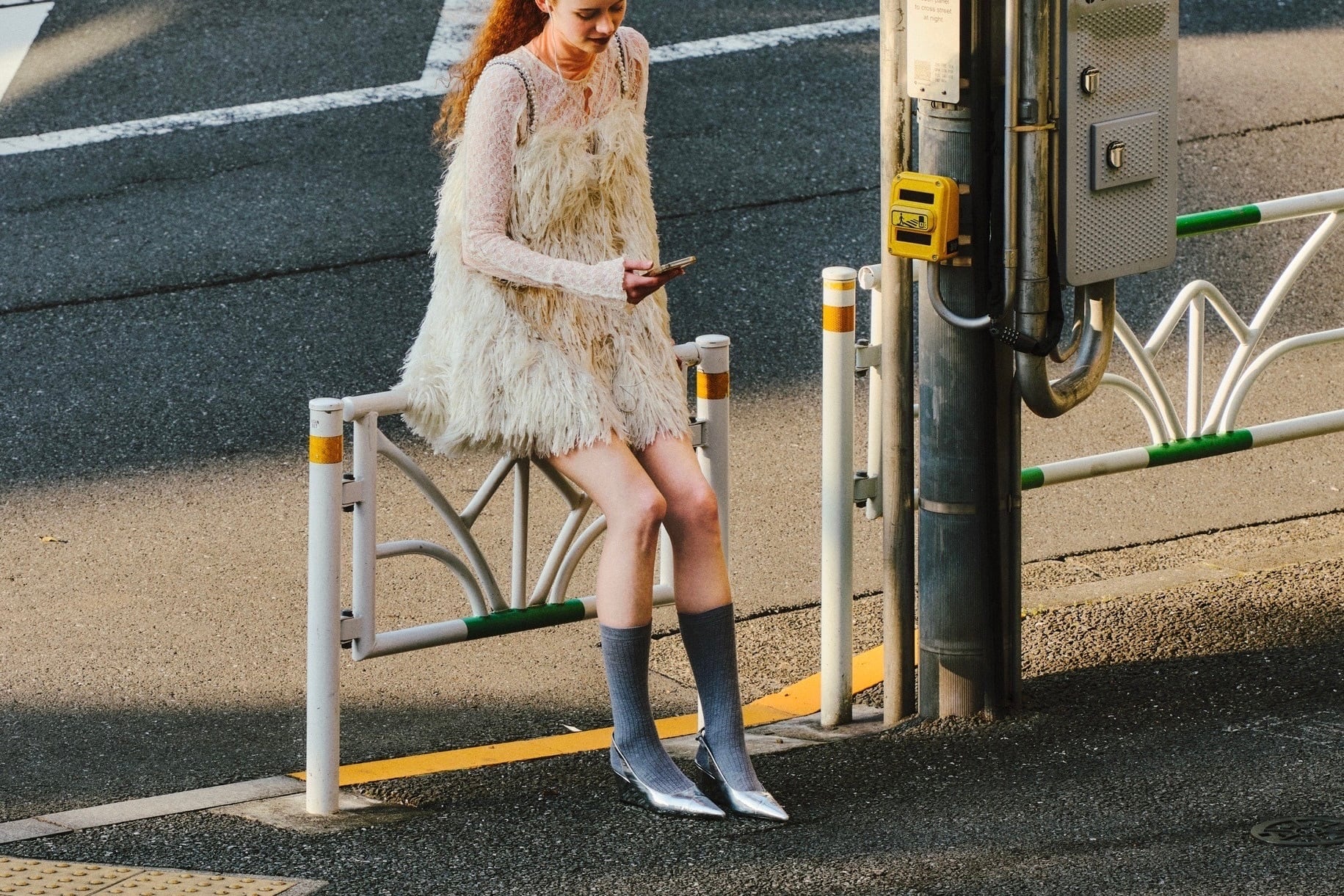 膝下からゴブラン生地を裁断し、身頃の未使用部分とともにパッチワーク状に切り替え縫製することで、存在感ある表情を生み出しています。