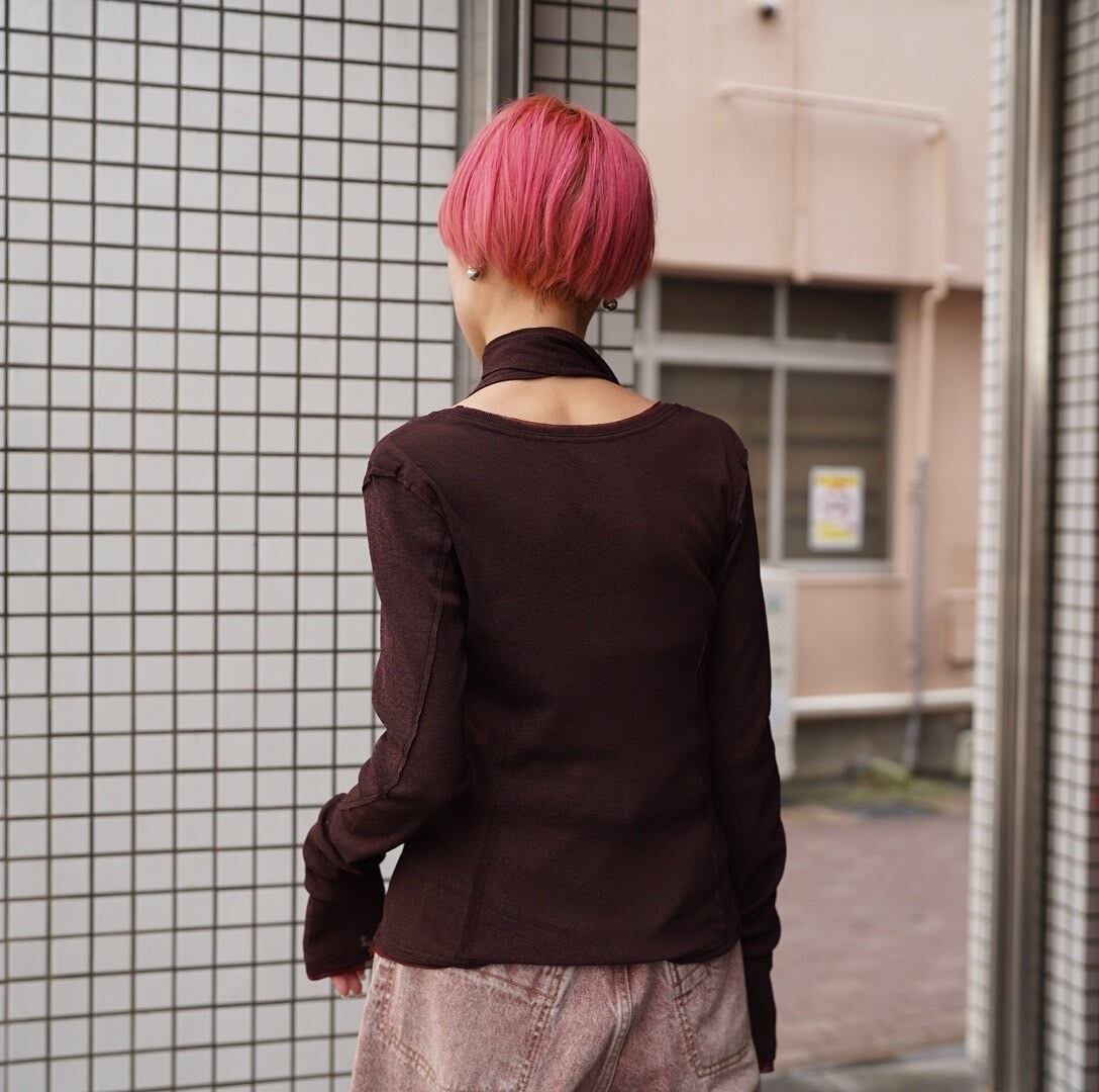 ・取り外しのスカーフがついたコンパクトなサイズ感がポイントのトップス。