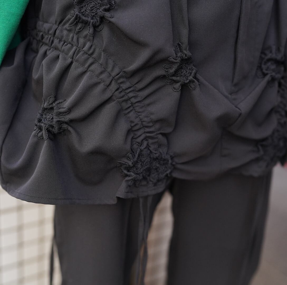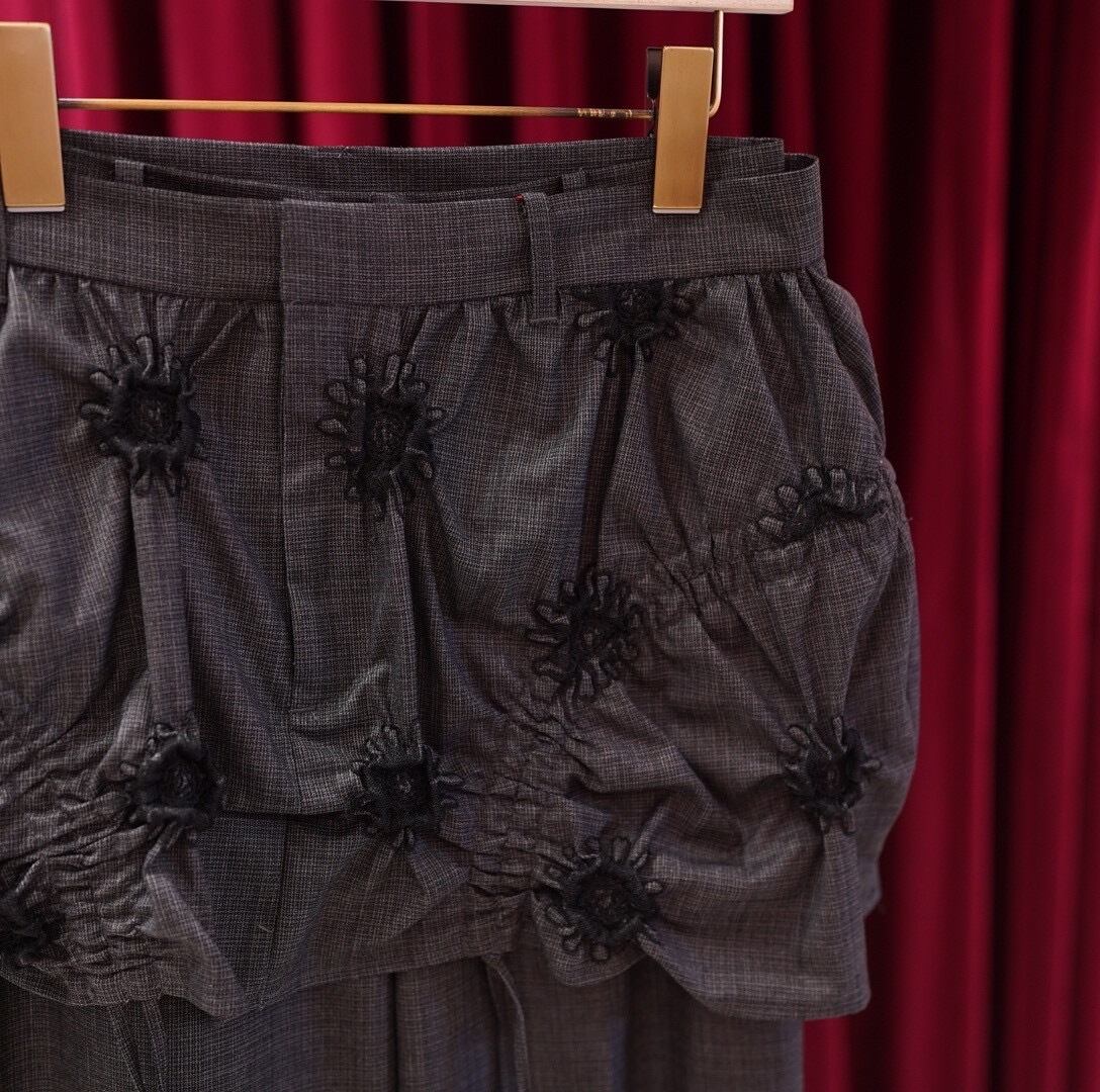 ・スカートにはフラワーモチーフのシャーリング加工を施し、他にはないアイテムに。