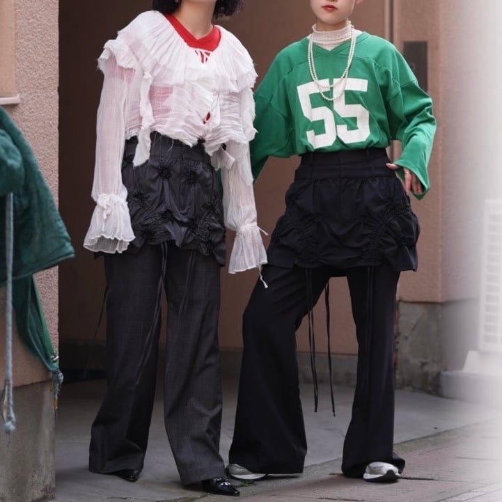 大胆なシャーリングデザインが目を引く、ミニスカートとパンツがセットのレイヤードボトムス。