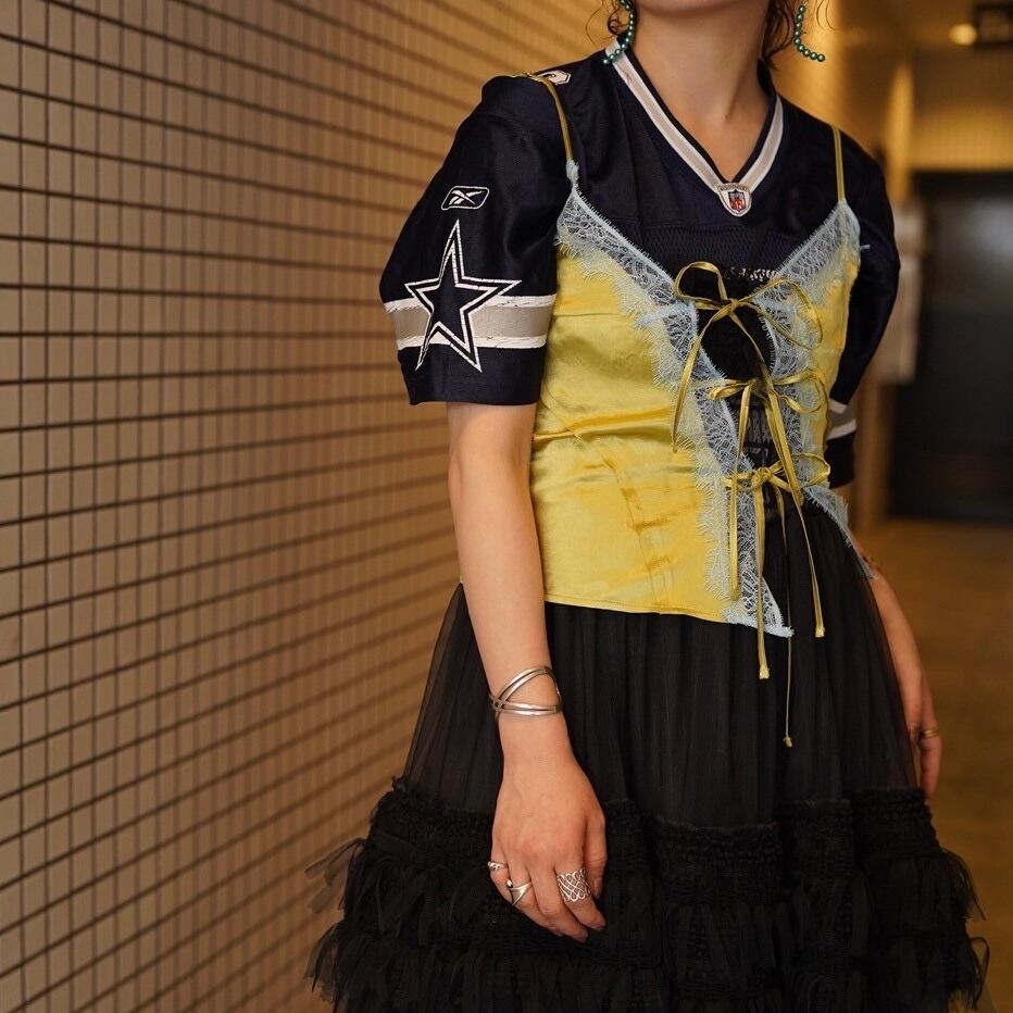 別注で染めたメゾンスぺシャルのオリジナルカラーのレーステープをドッキングしておりキャッチーな雰囲気に。