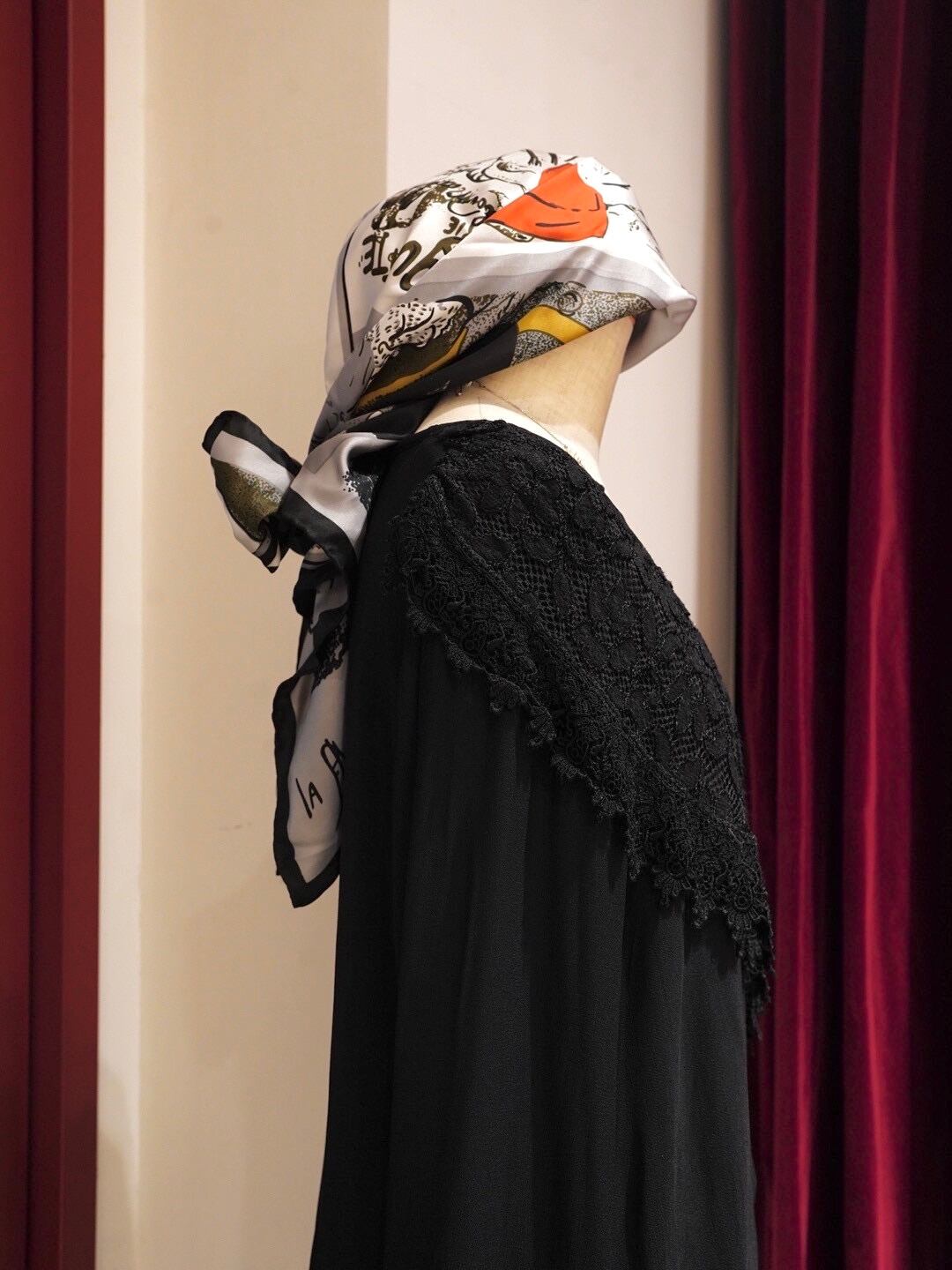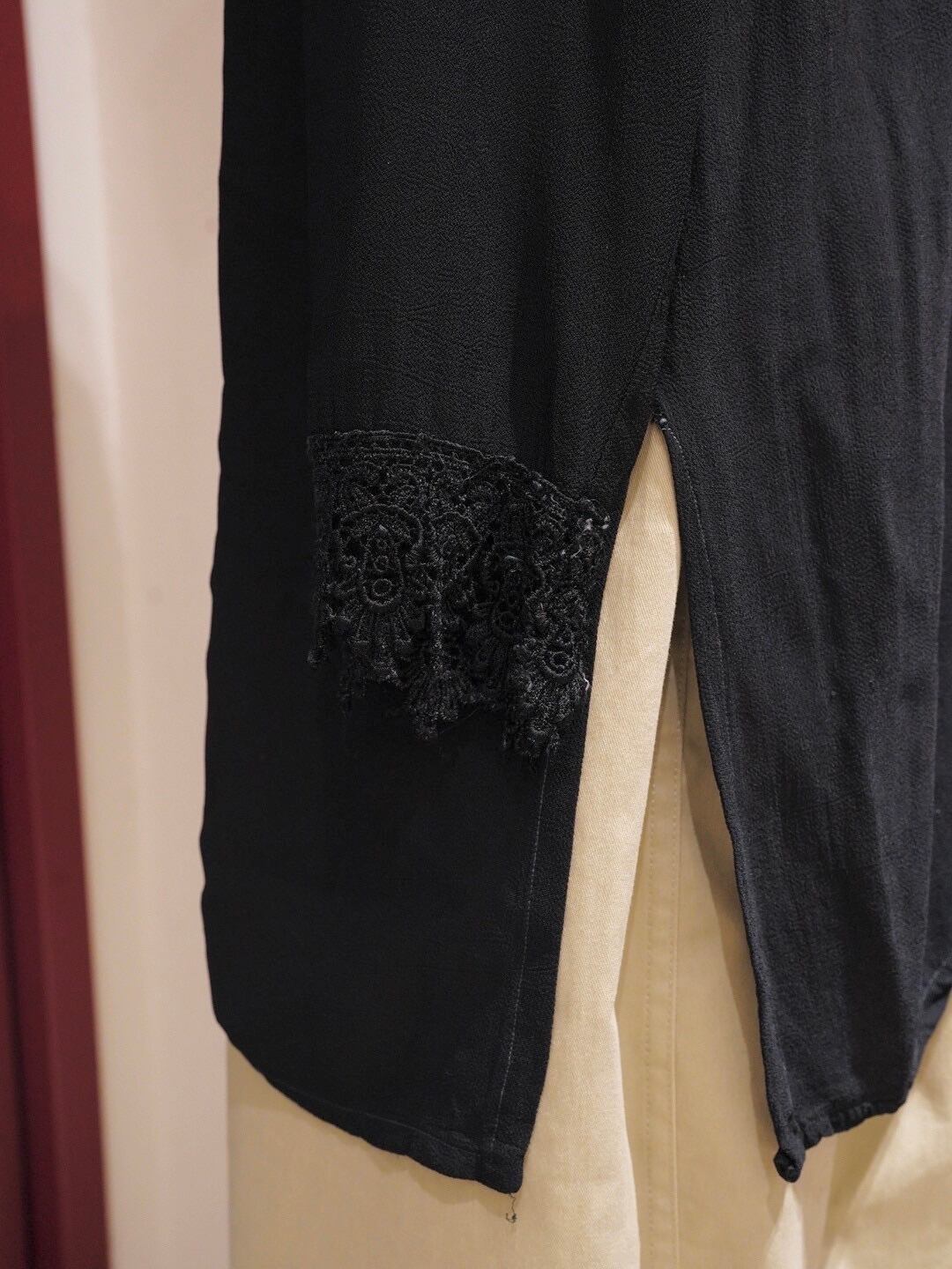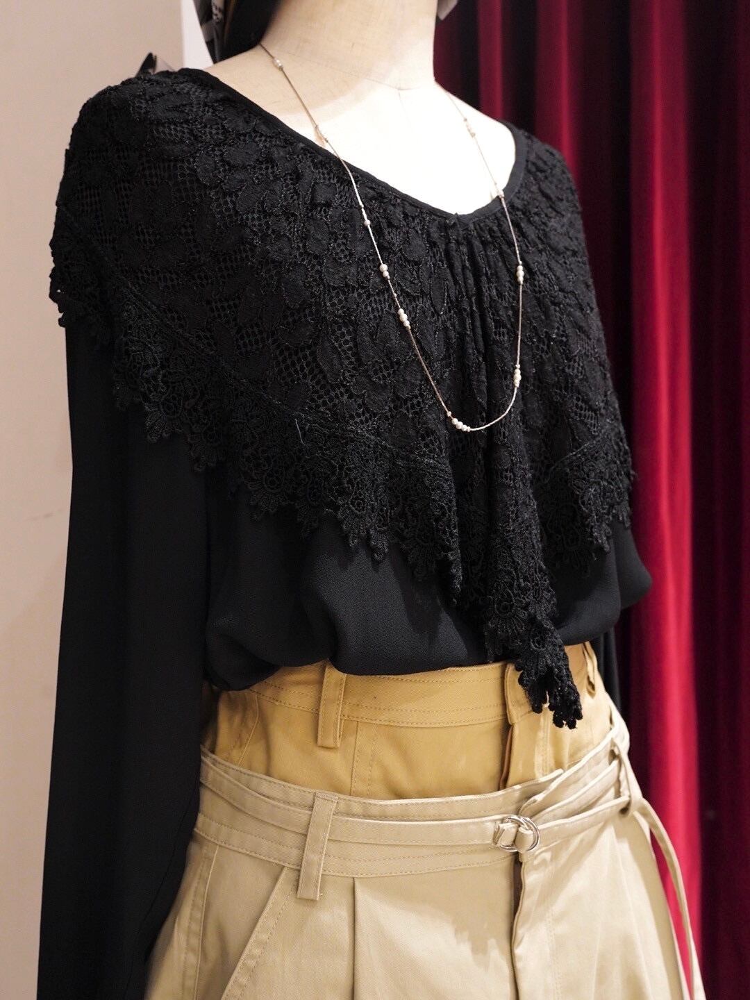 首元にあしらわれた繊細なレースが上品なアクセントに。