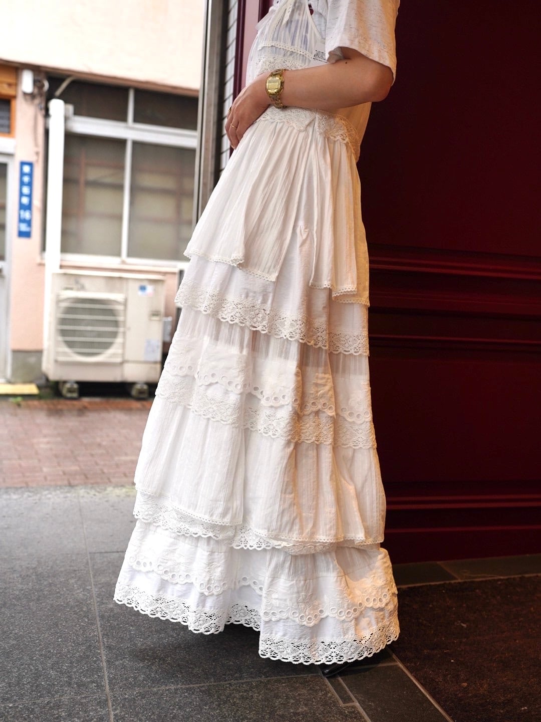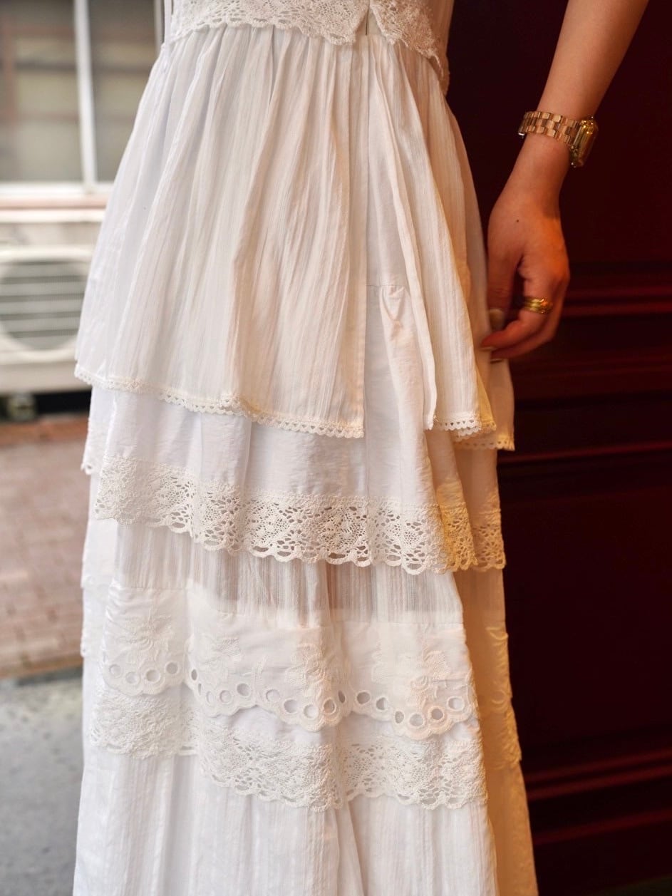 ・フリルやテープを贅沢に使用し、配置やデザインに拘りぬいたボリューミーでフェミニンなマキシワンピース。