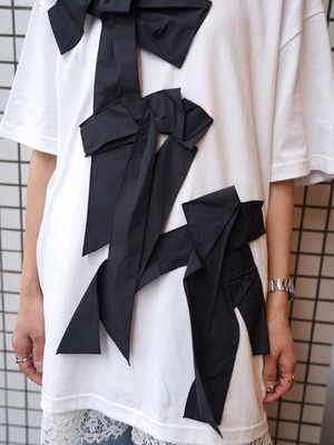 ・オーバーシルエットなTシャツにリボンモチーフをイメージして装飾したデザインTシャツ。