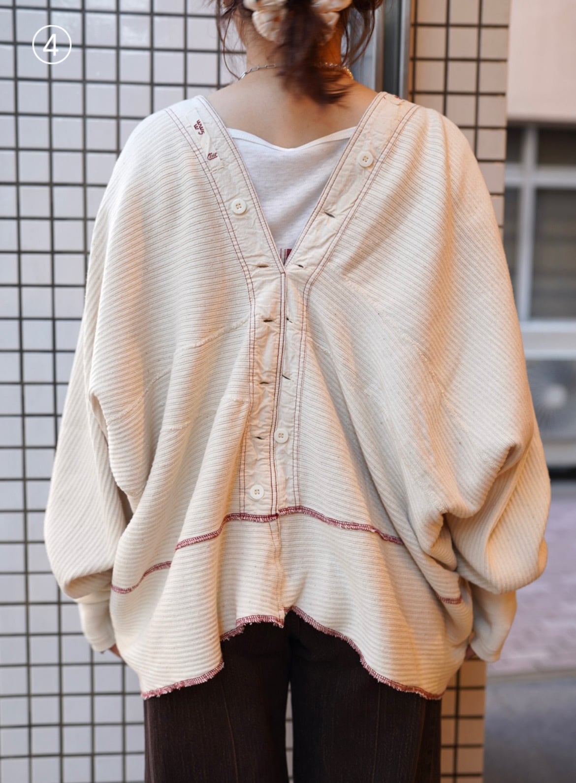 デッドストックのライナーパンツを解体し、カーディガンへと再構築した一点物。