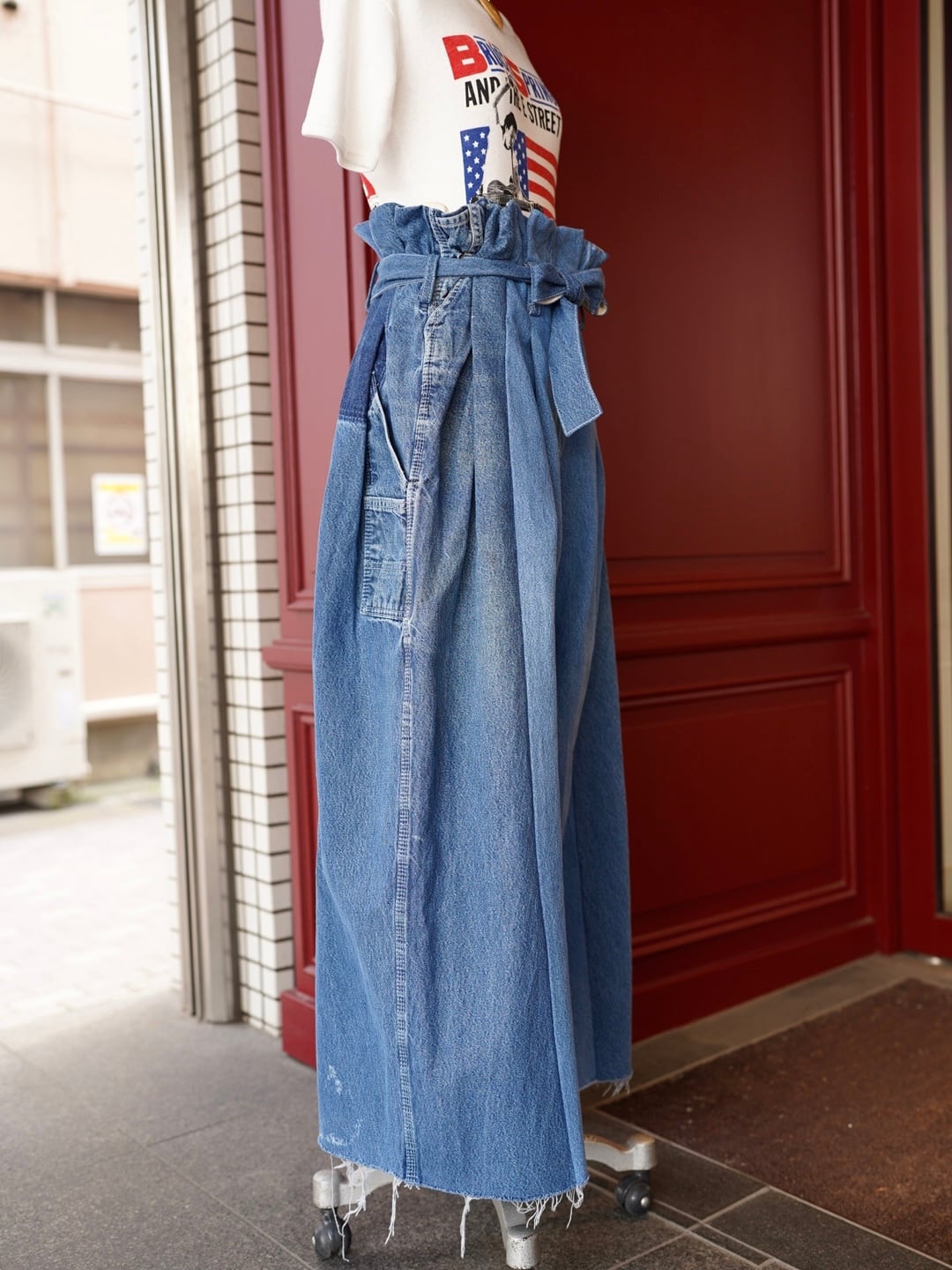 身頃のウエストから上をカットし、中央と外側を組み合わせることで、存在感のあるワイドシルエットへと再構築しています。