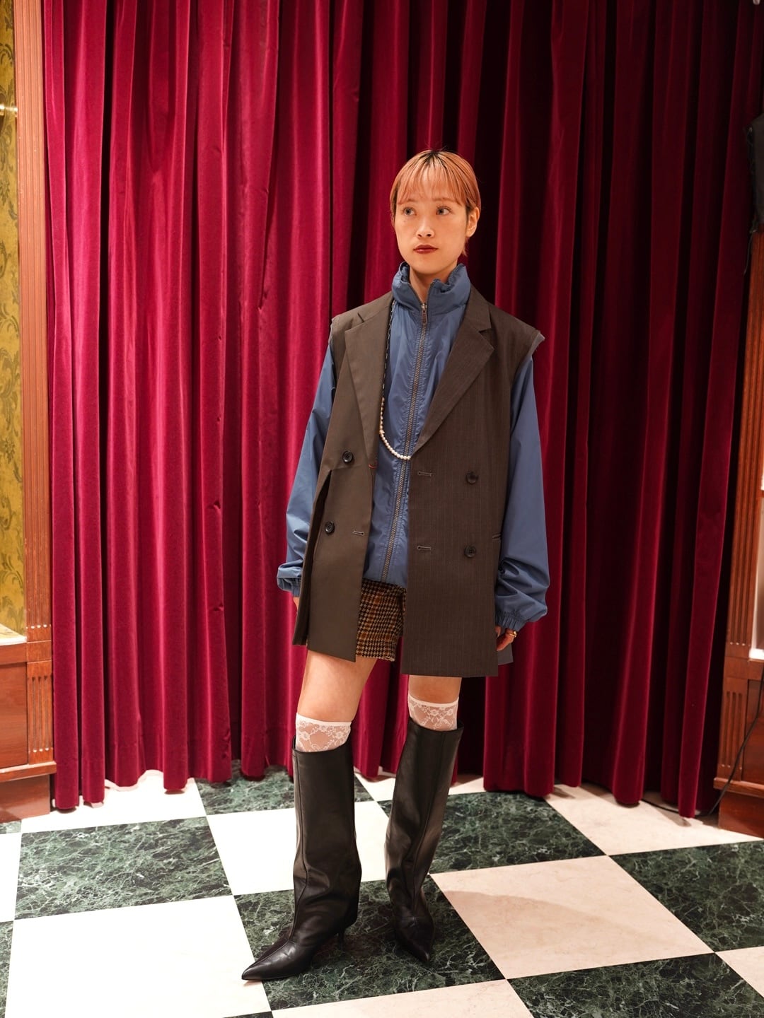 ・端正なテーラードベースに、サイドへ大胆に配されたチュール素材をドッキングし、トラッドとモード、透け感と重厚感、相反する要素が共存するジレ。
