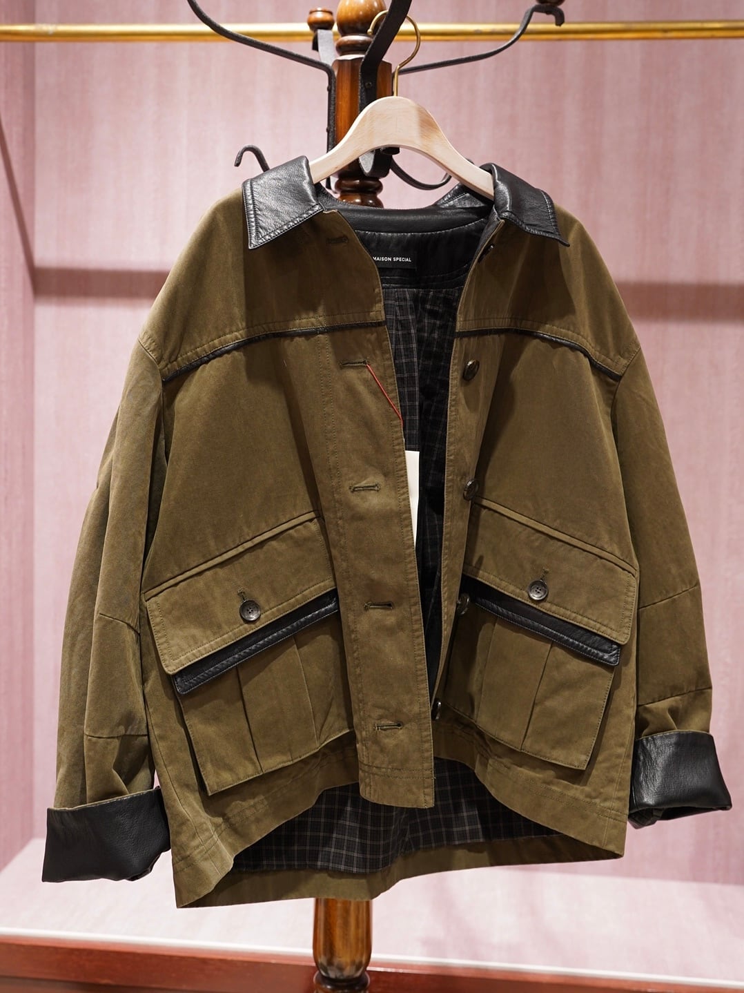 上品な質感の異素材を組み合わせることで、カジュアルにもモードにも着こなせる一着に仕上がっています。