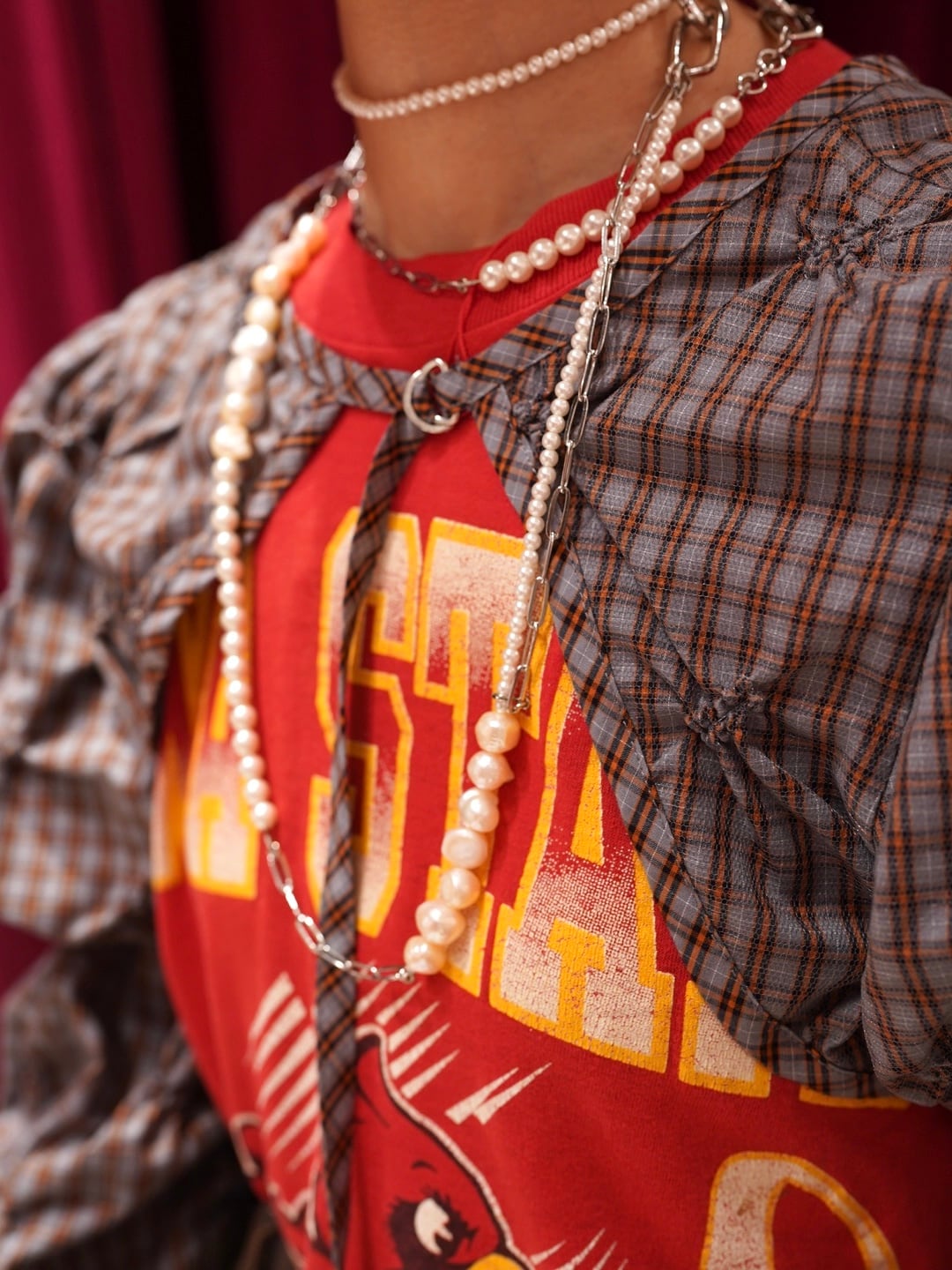 グレー×オレンジのチェック素材とグレーの粗めのチュール。