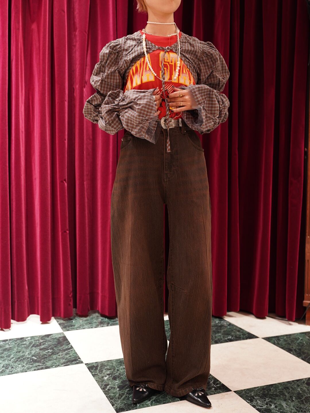 ラメデニムを使用しており、雰囲気のある一着に。
