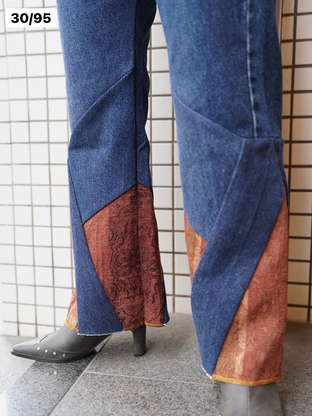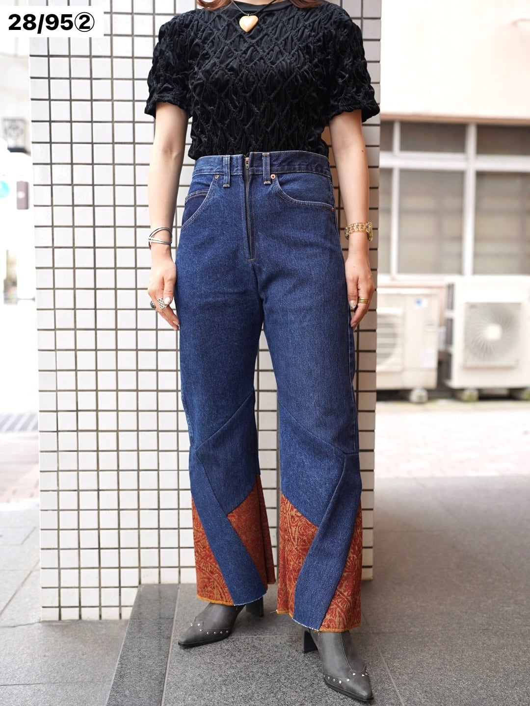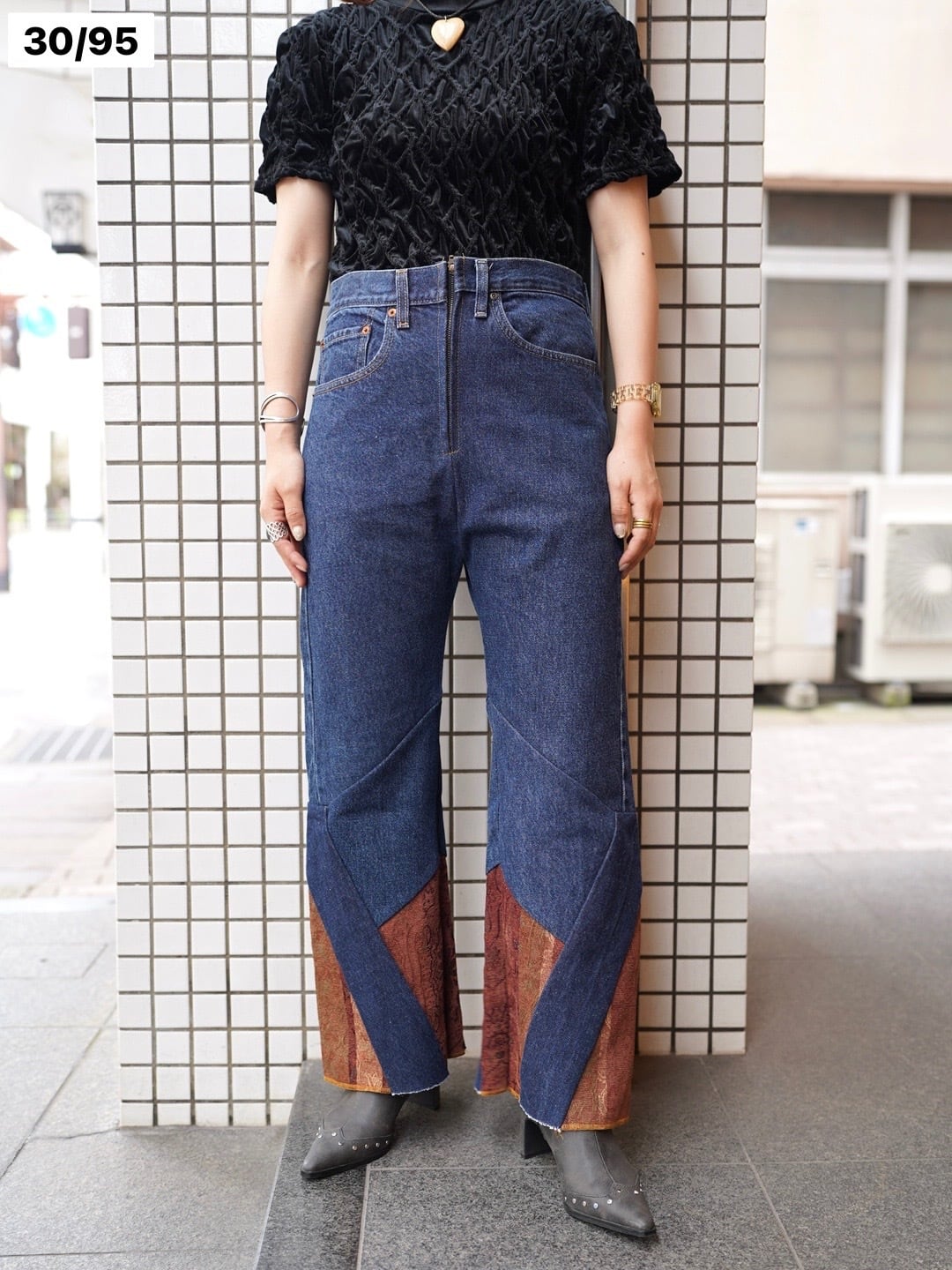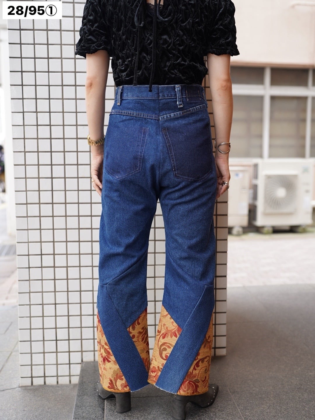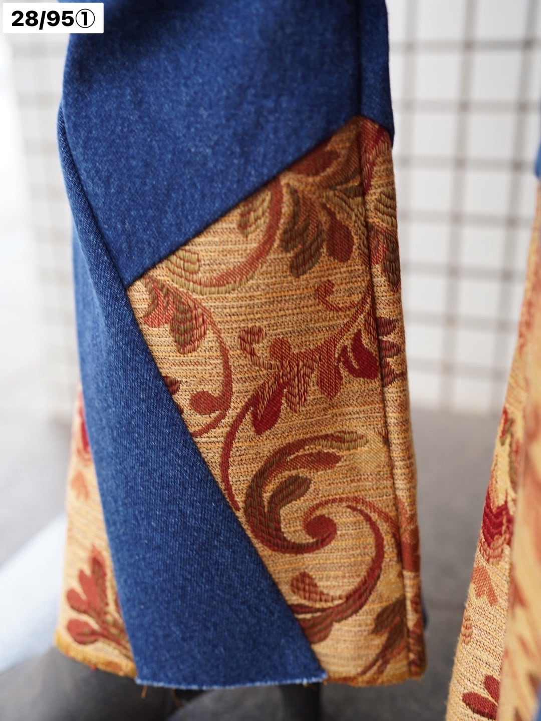 USEDのデニムパンツとUSEDゴブラン生地を再構築して仕立てた、唯一無二のリメイクデニム。