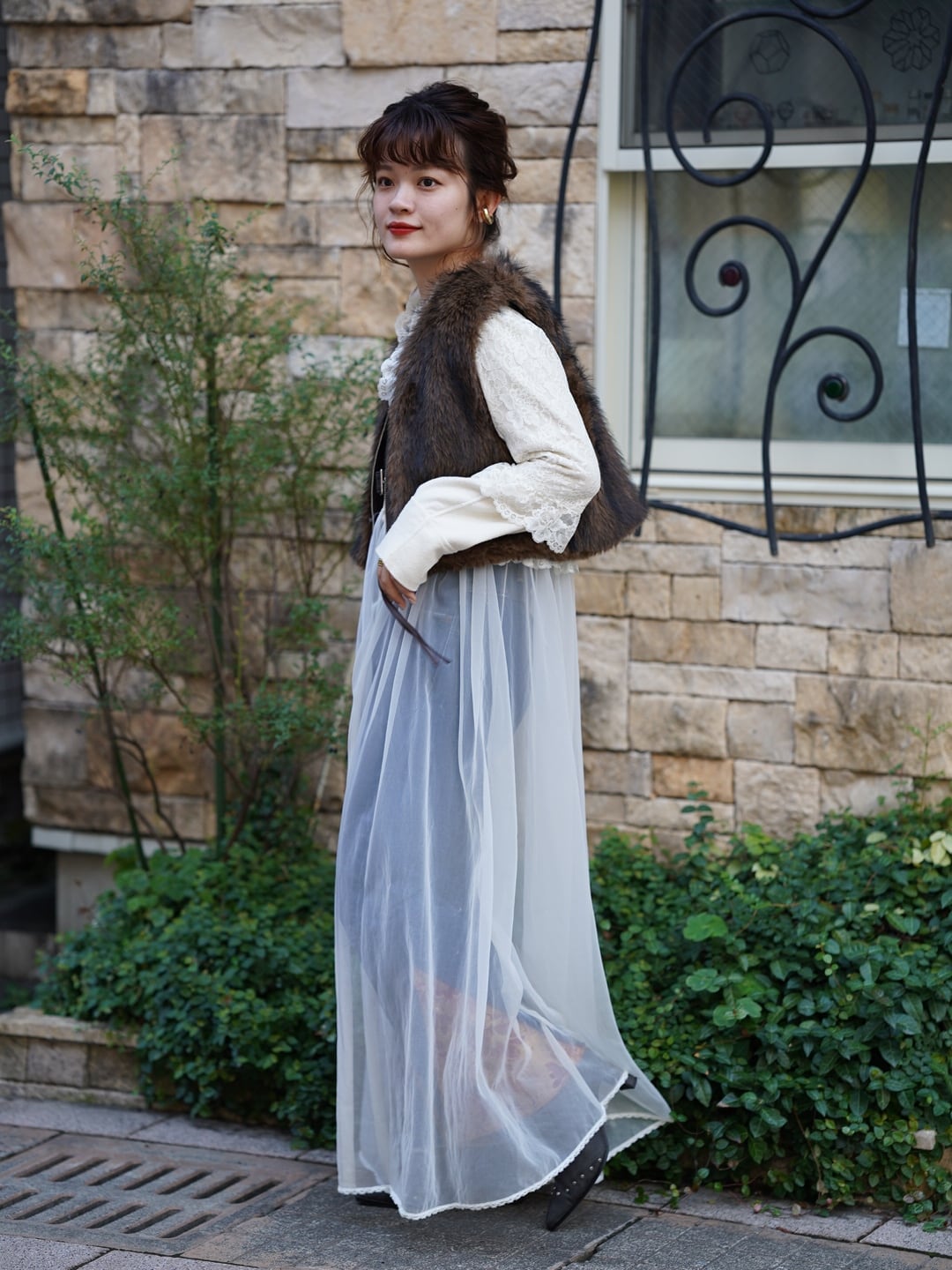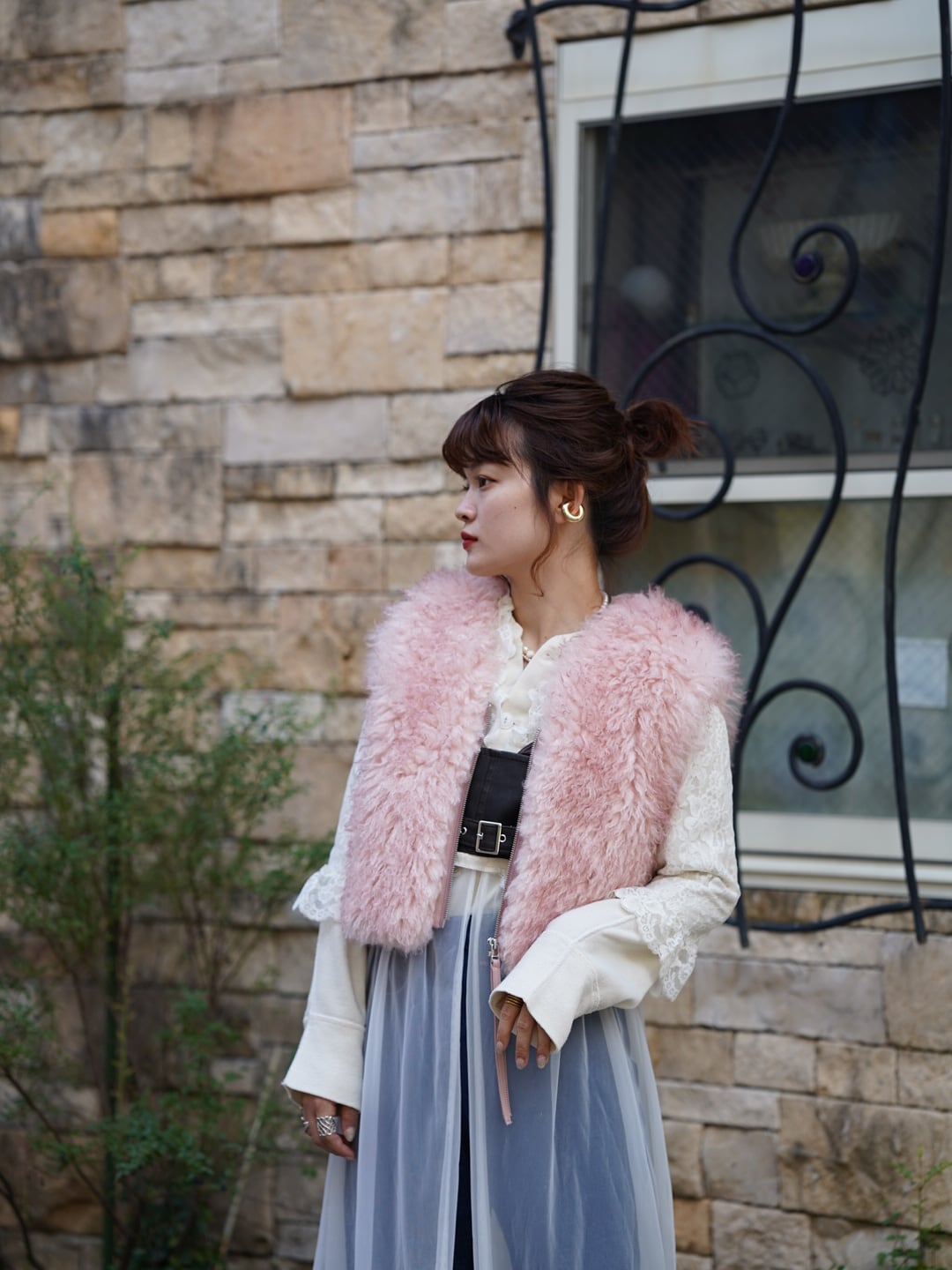 ・大胆な毛足の長いシャギーファーが目を引く、シーズンムードたっぷりのアイキャッチベスト。
