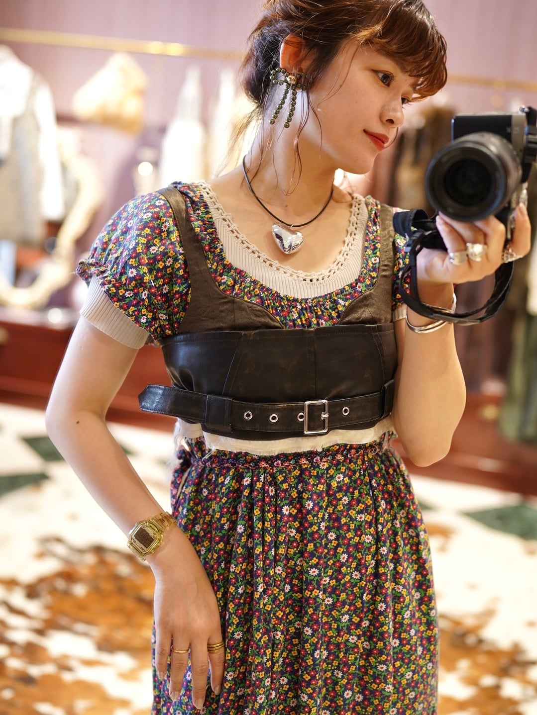 ・ヴィンテージライクな風合いが目を引くビスチェは、エッジの効いたスタイリングに欠かせない一着。