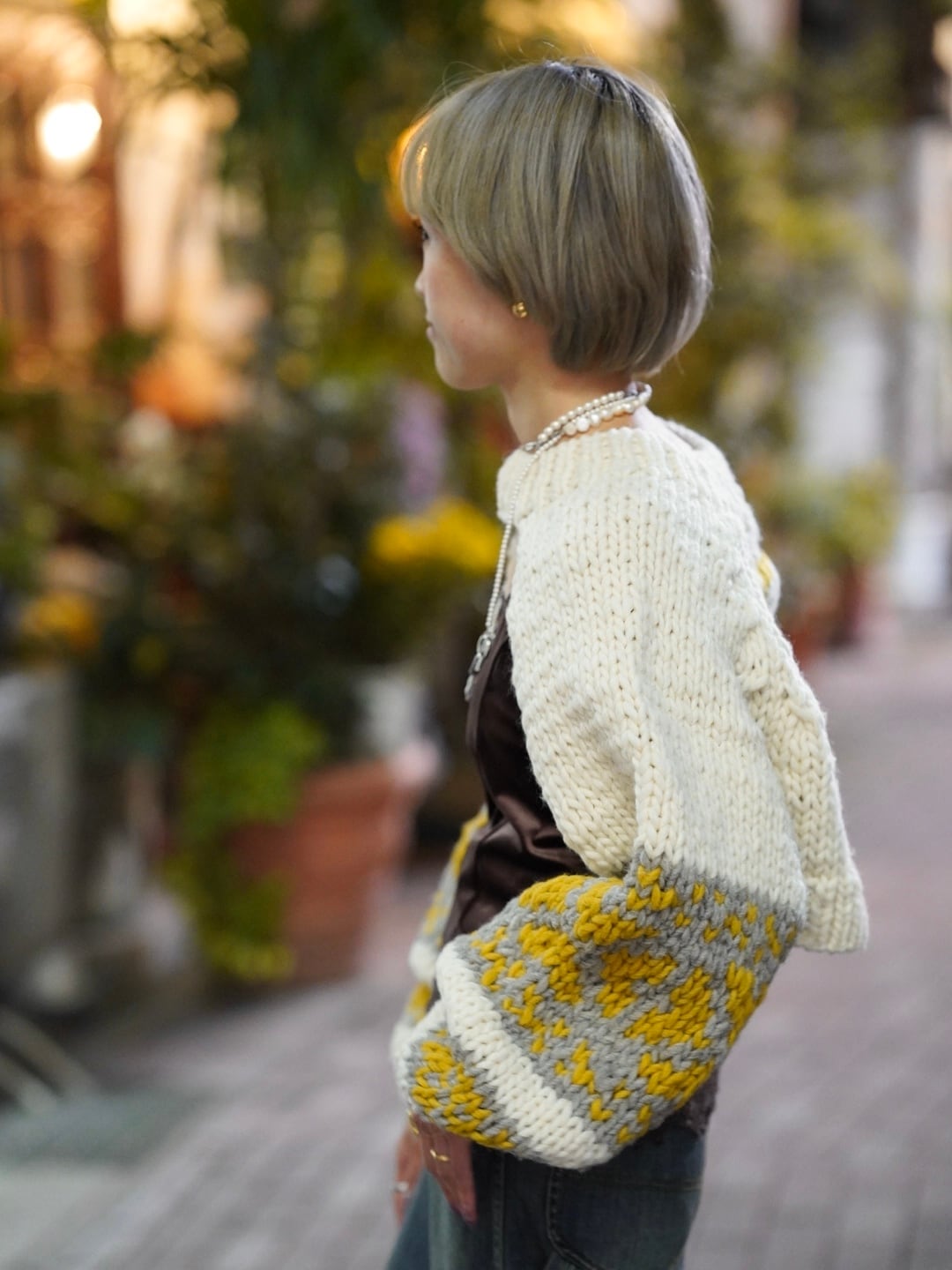 ブランド定番、ウール100%の極太ロービング糸を使用し、ハンドメイドで編み上げたカウチンセーター「Cowichan Knit Bolero」。袖ボレロタイプで、前後どちらでも着ていただけるデザインです。ショート丈のため、パンツスタイルやワンピースともバランスよくコーディネートをお楽しみいただけます。