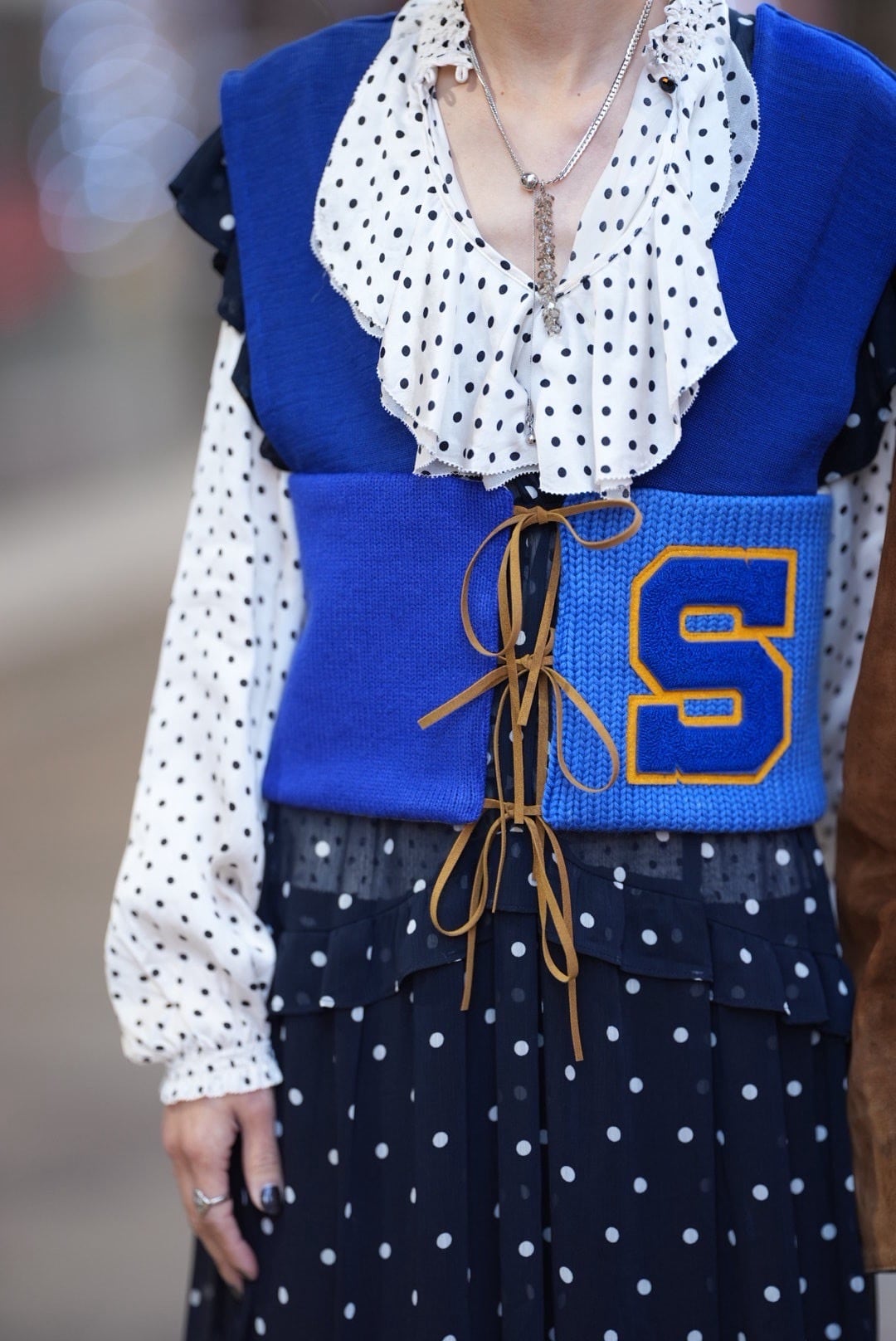 見頃中心にはフェイクスエードのリボンテープを搭載し体型やインナーのアイテムを問わず、アームホールも広いので、スウェットやジャケットの上からでも、ストレス無くレイヤードが可能です。