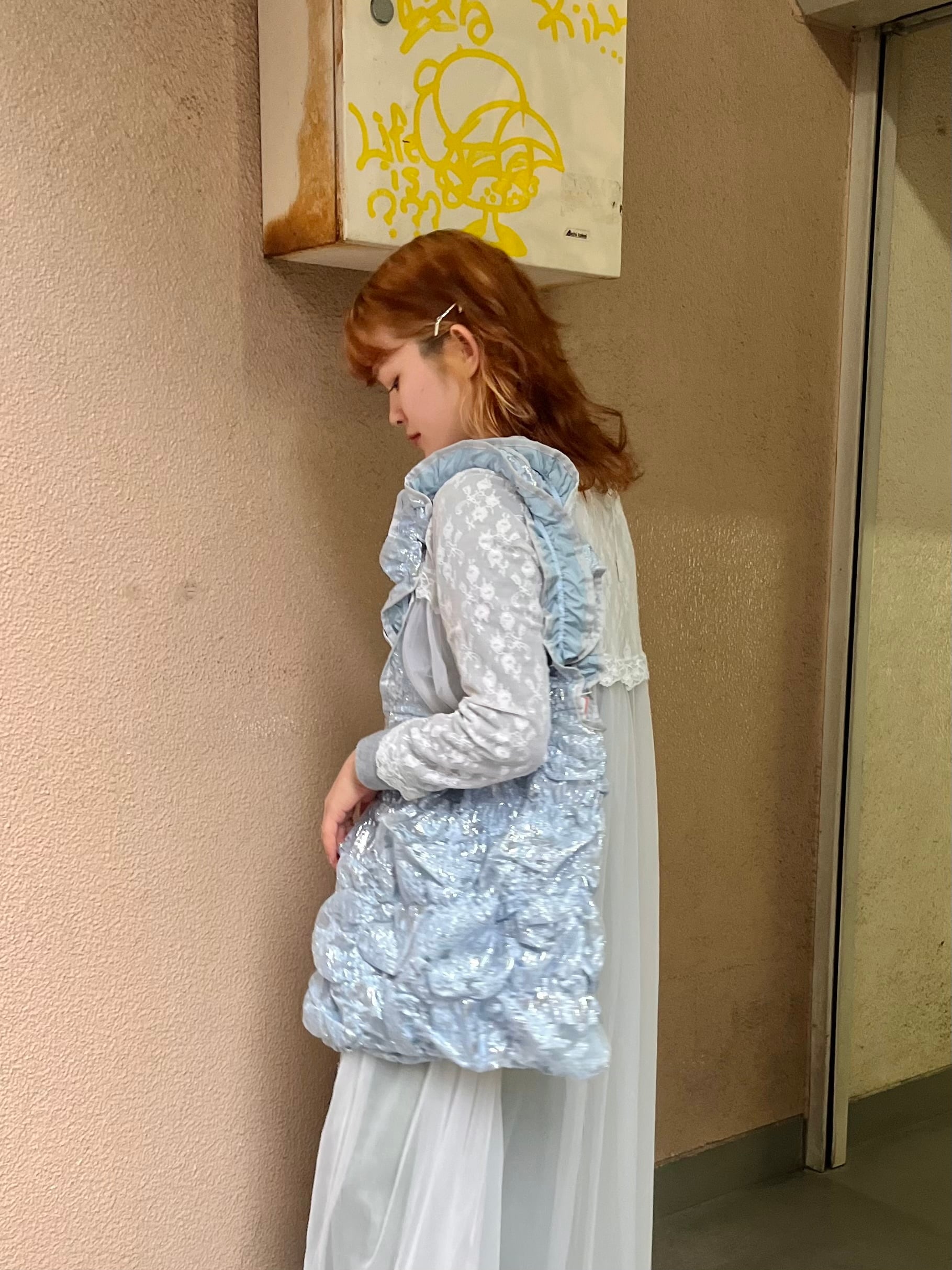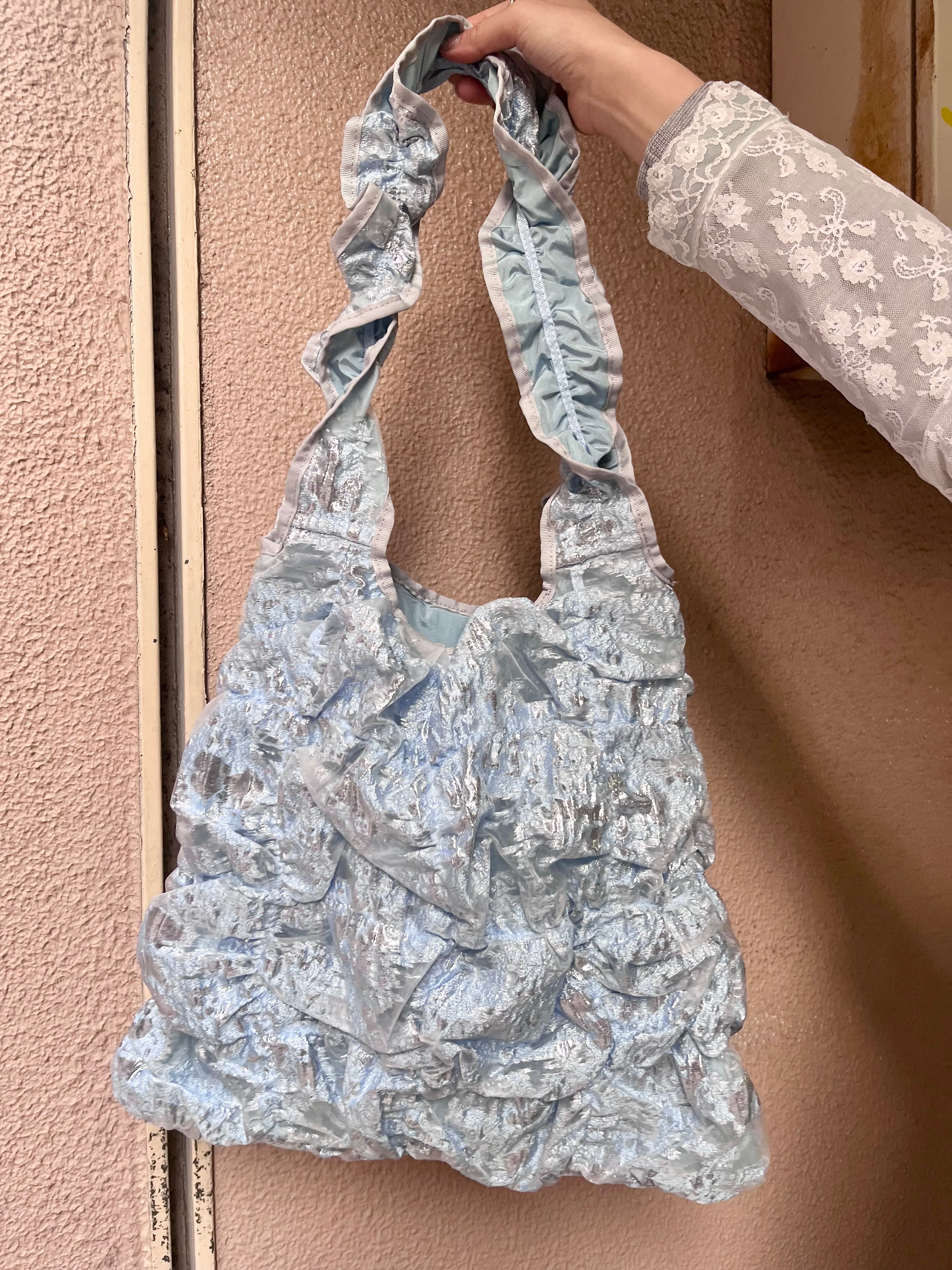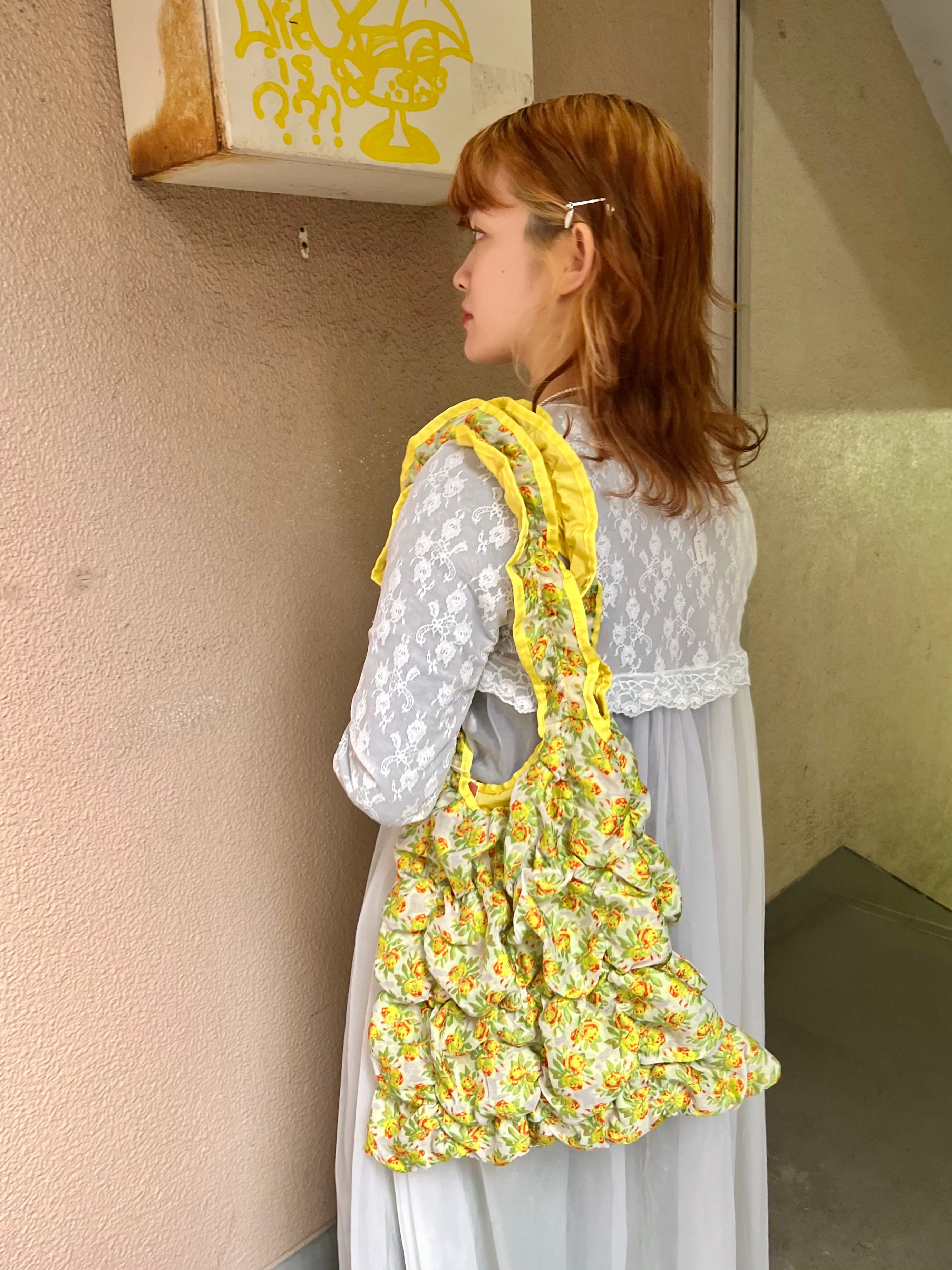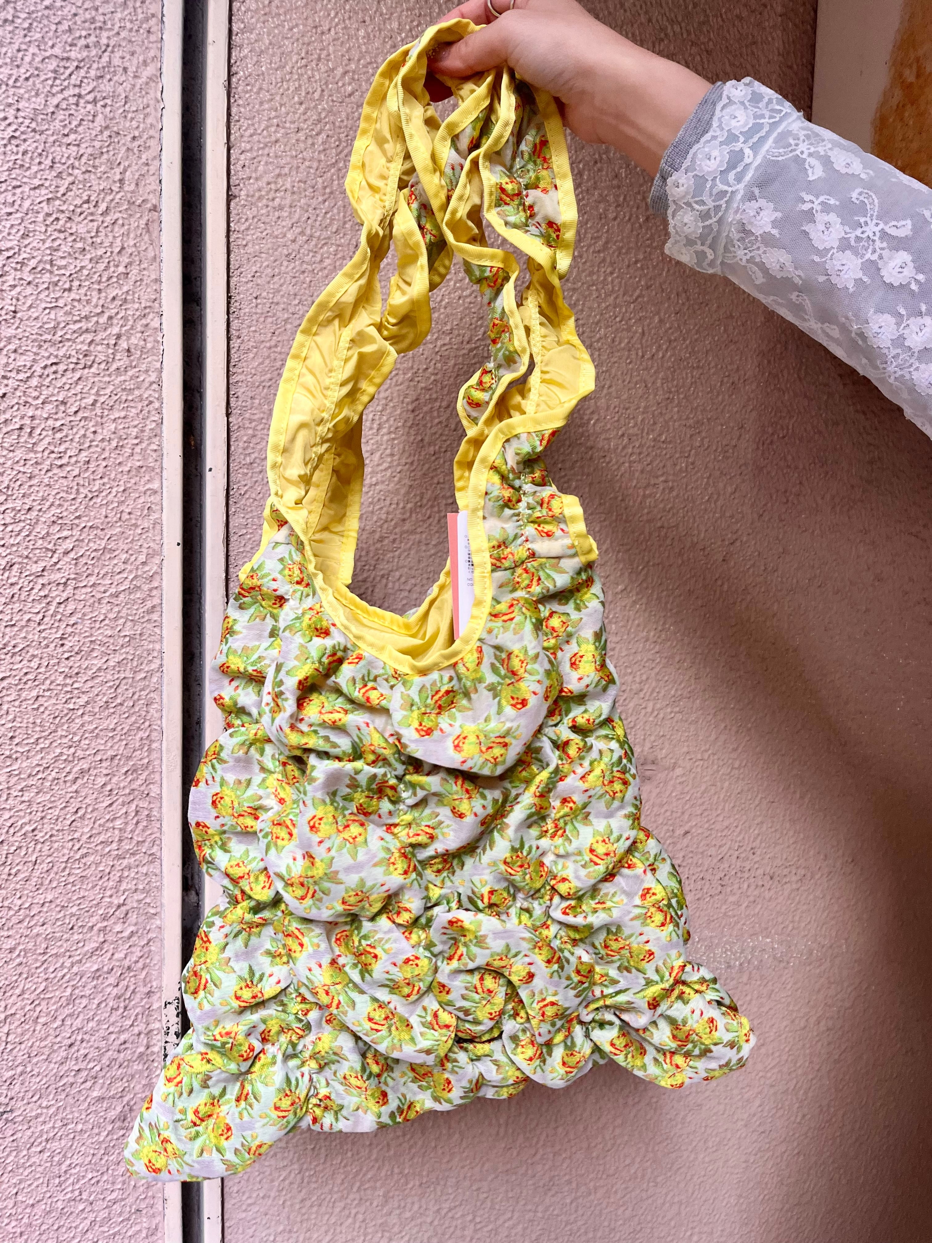 肩掛けできるハンドルの⾧さ、裏地との異素材感がポイントです。