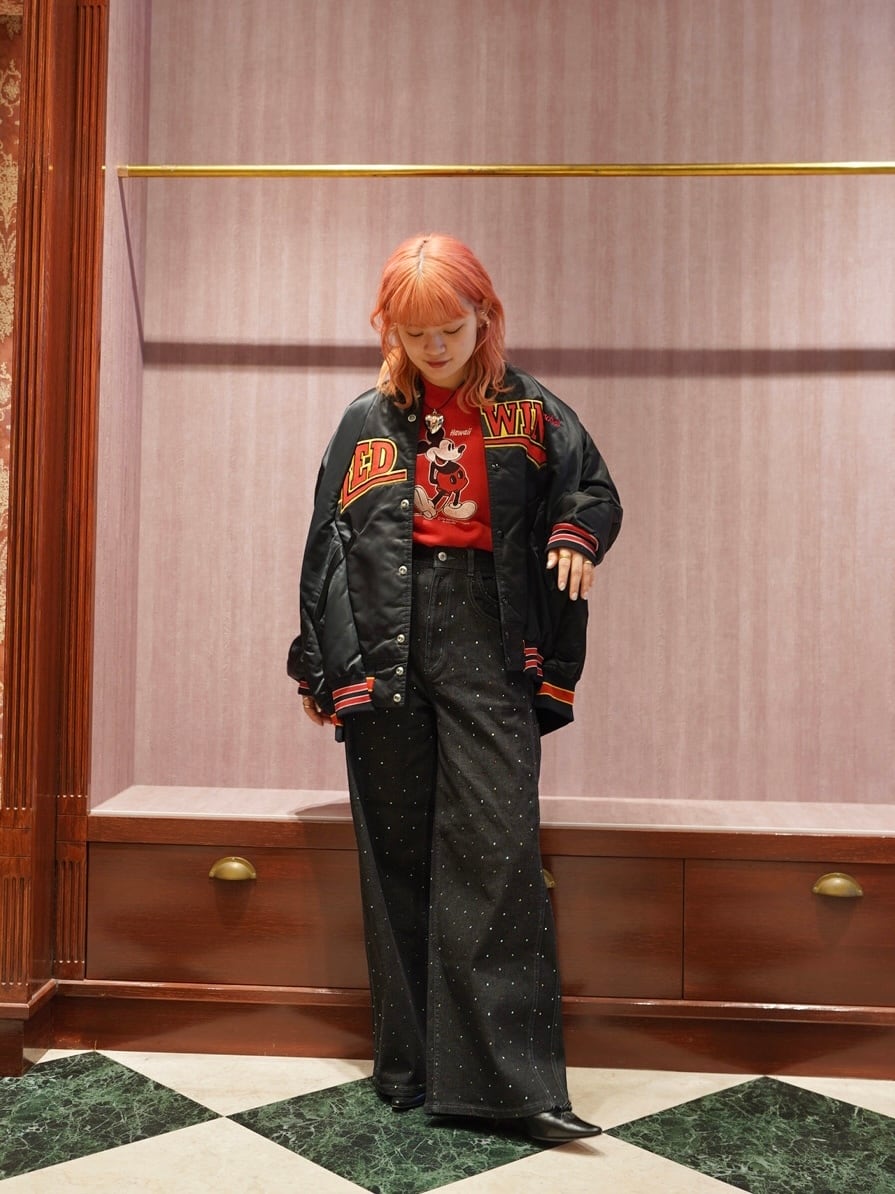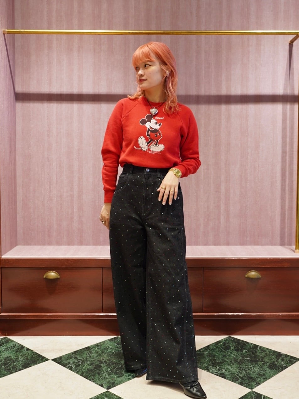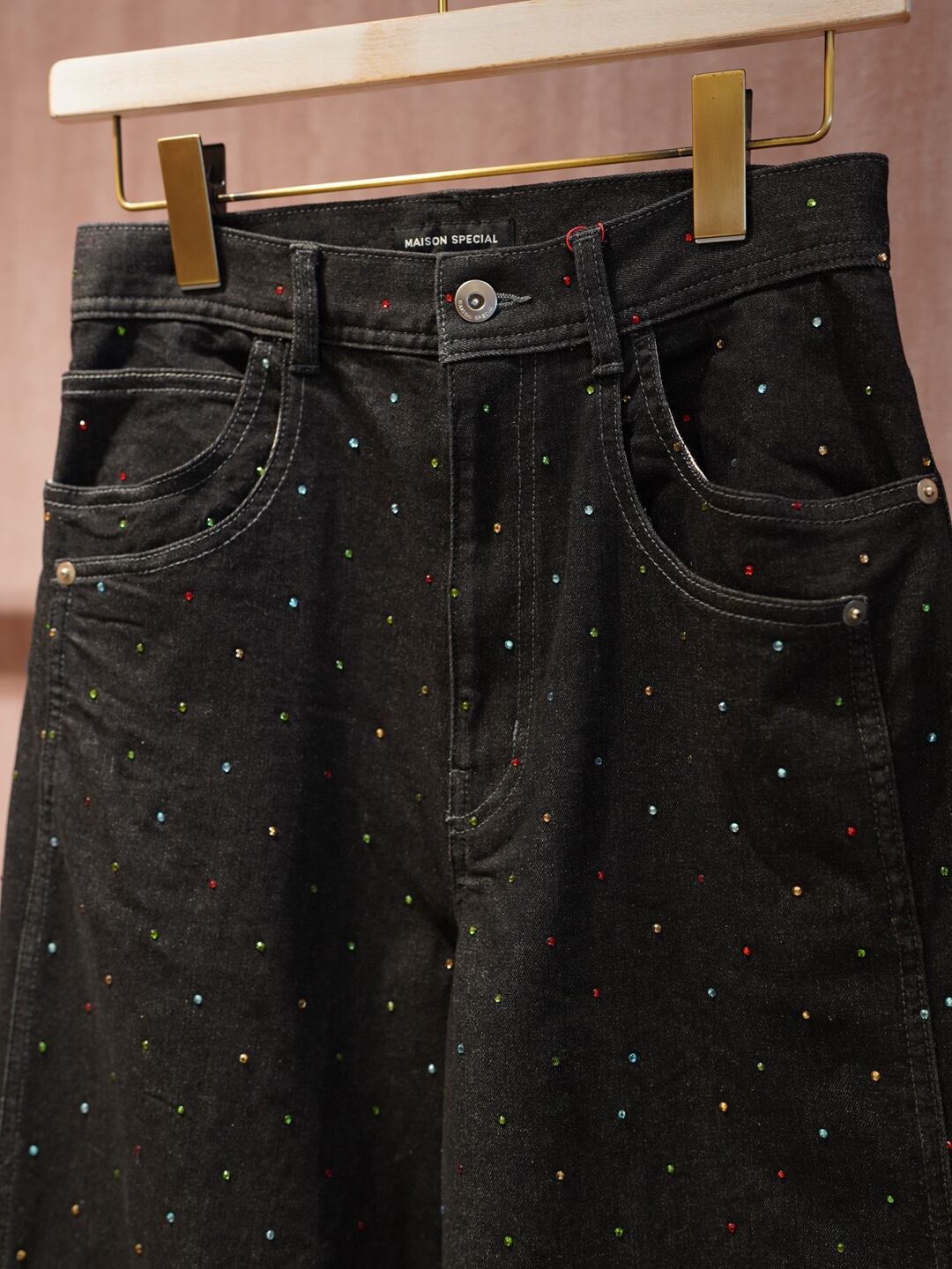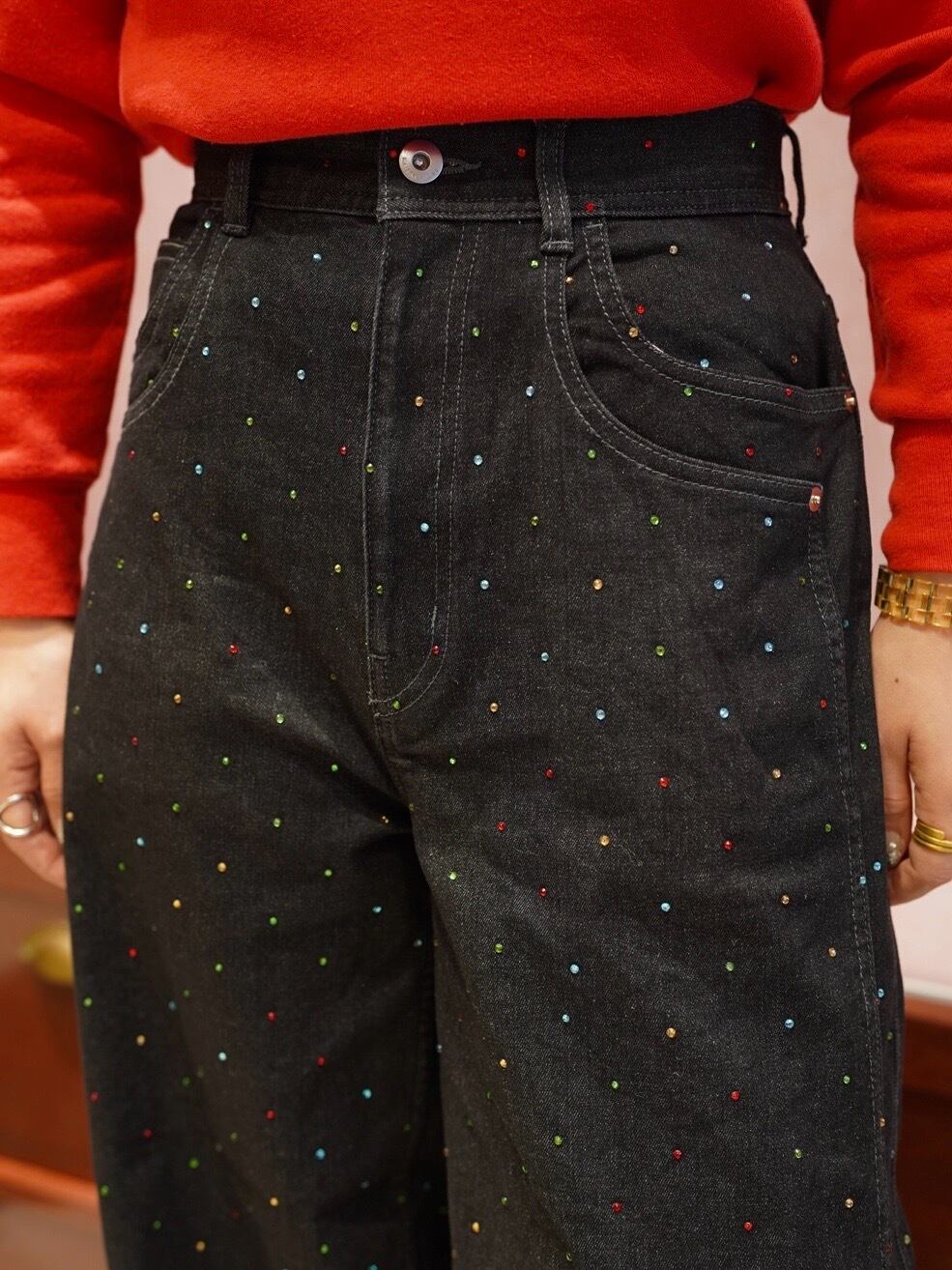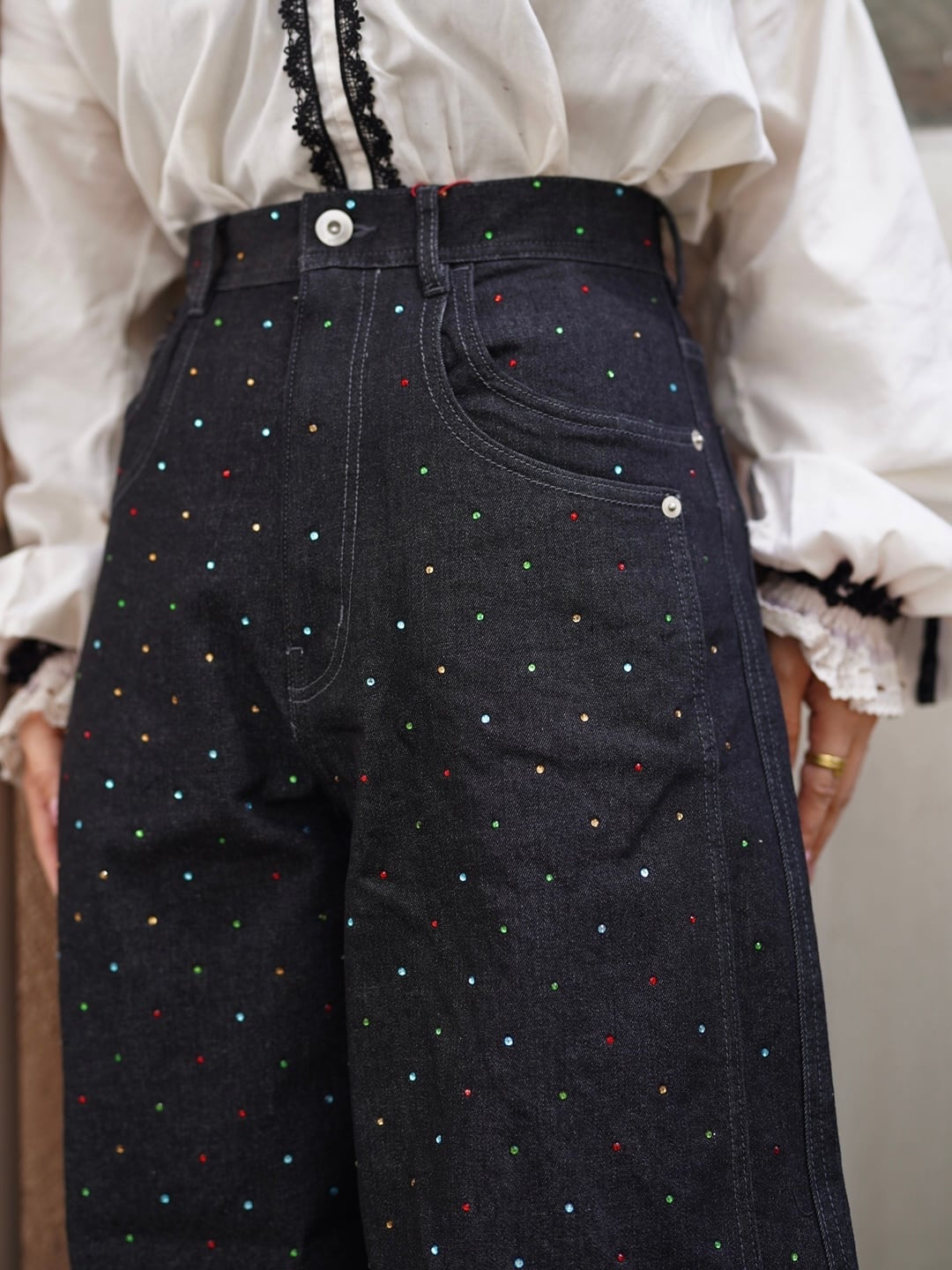 カラフルなラインストーンを散りばめ、ベーシックなデニムに華やかさをプラスしました。