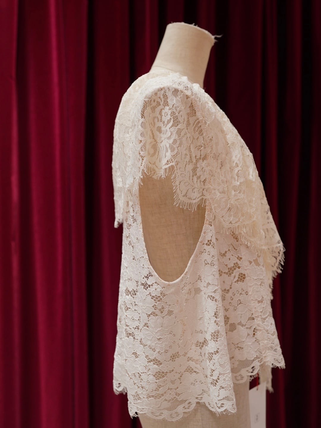セットアップ対応のパンツはサイドにレースをあしらった華やかなディテールがポイント。
