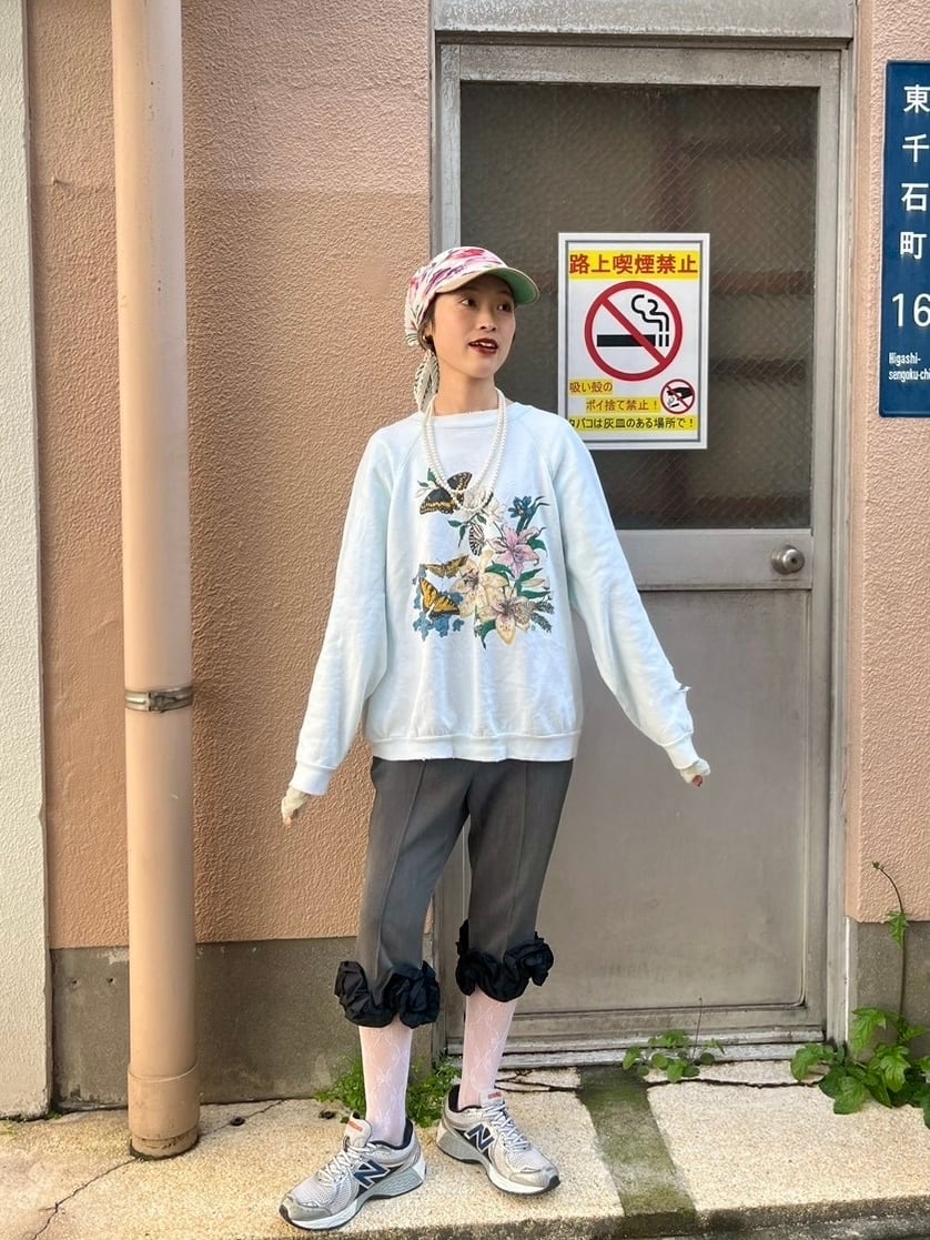 マニッシュなパンツに大胆なフラワーモチーフをプラス。