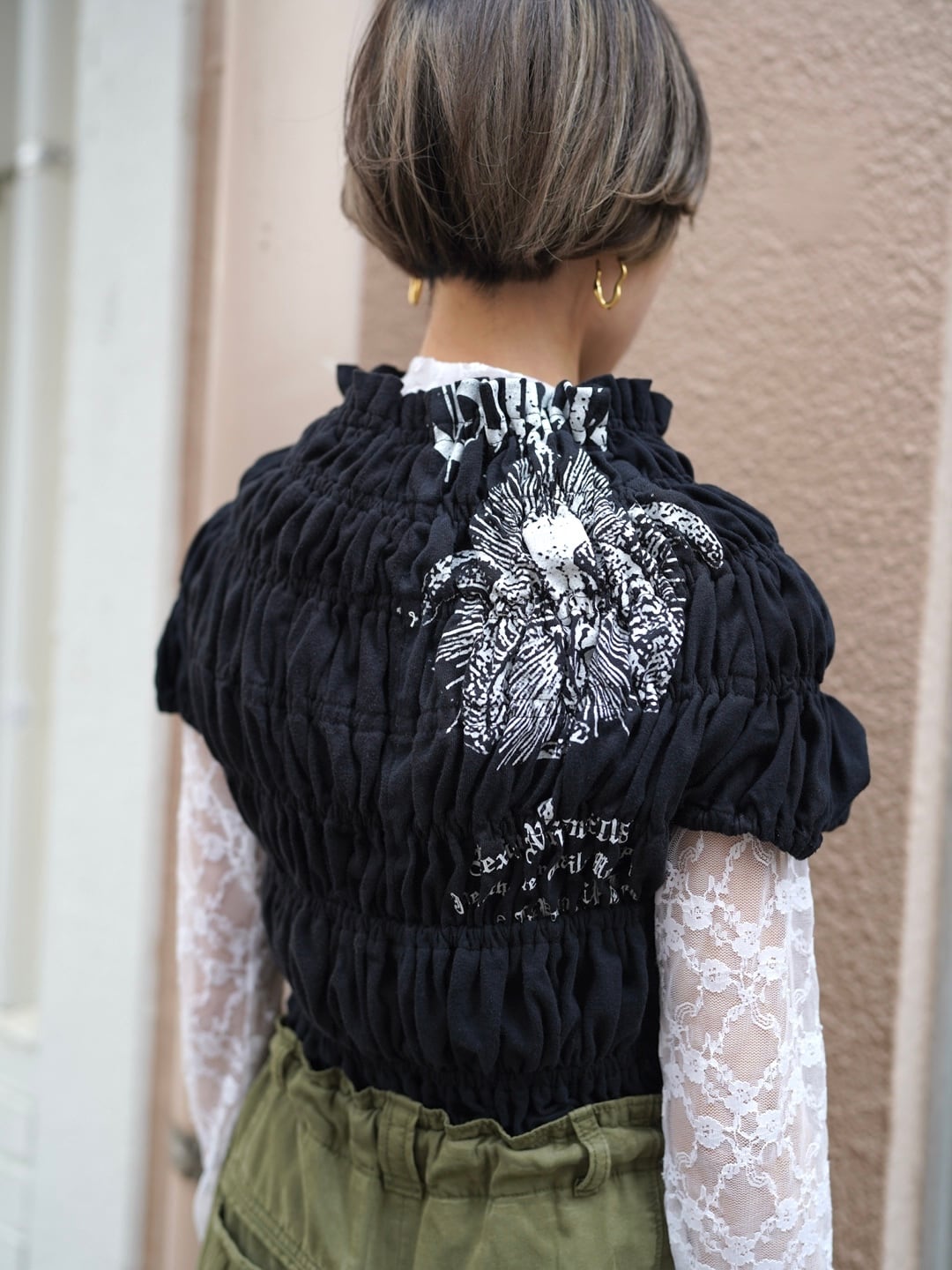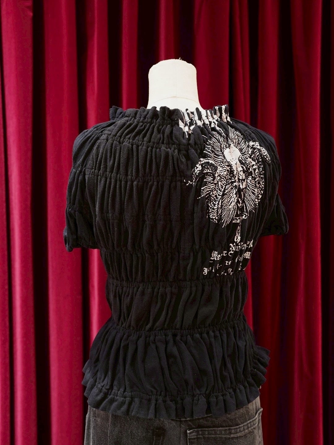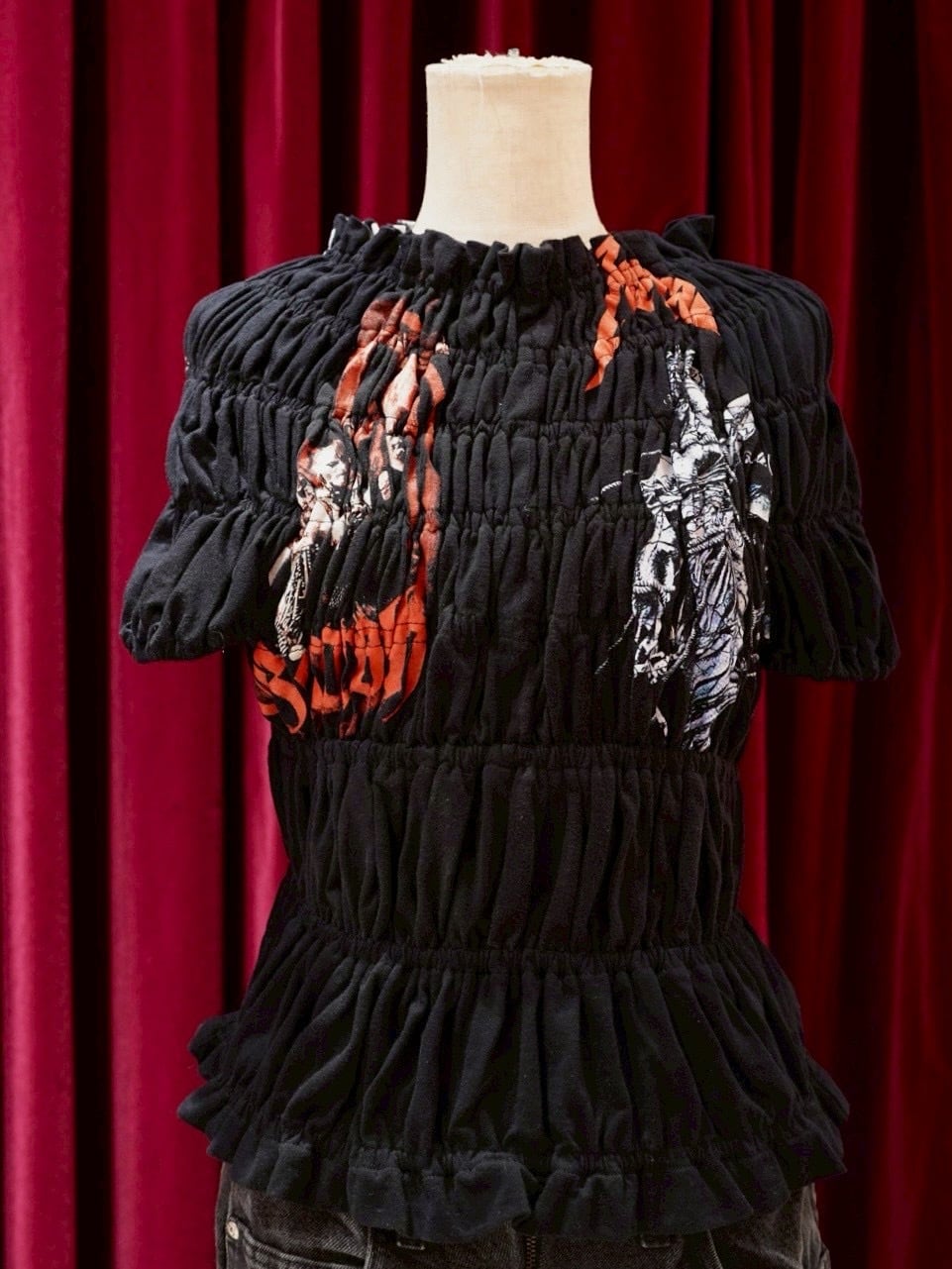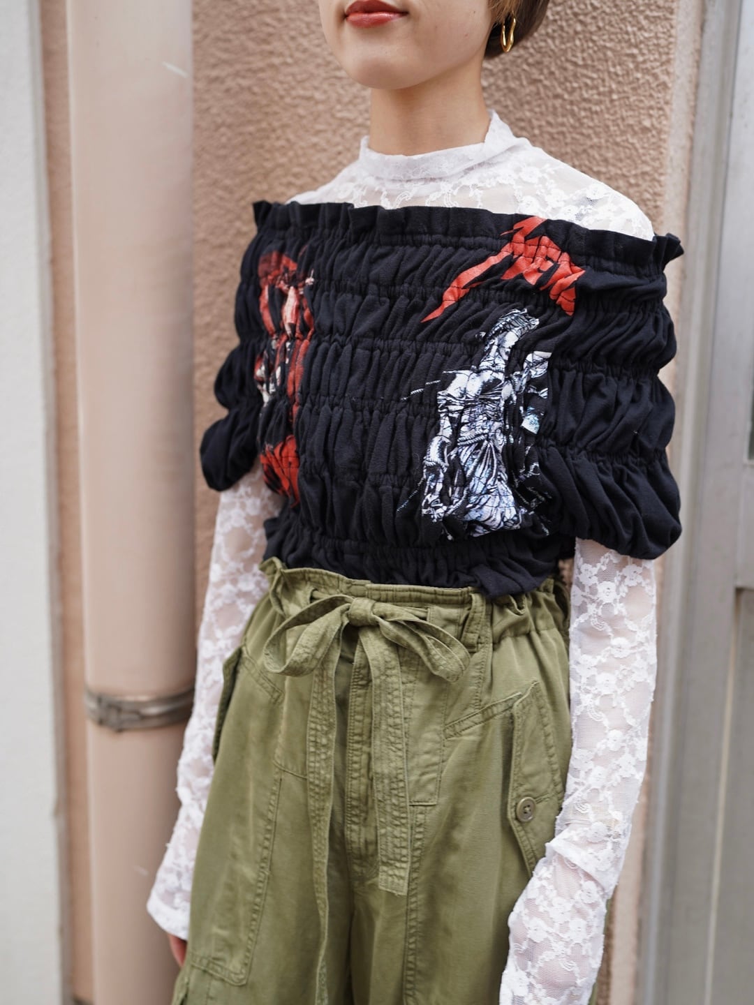 シャーリングをたっぷり寄せて仕立てたリメイクトップス。