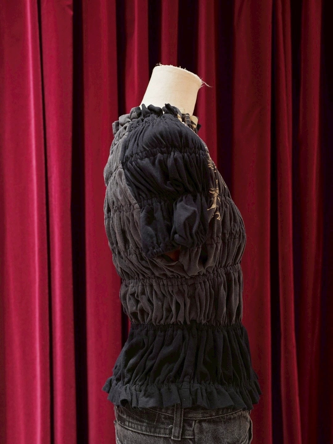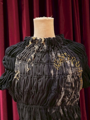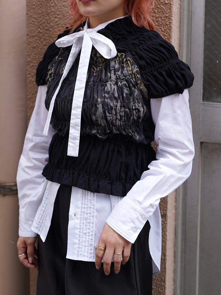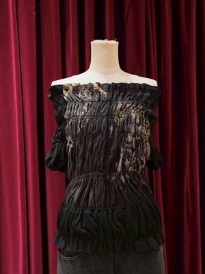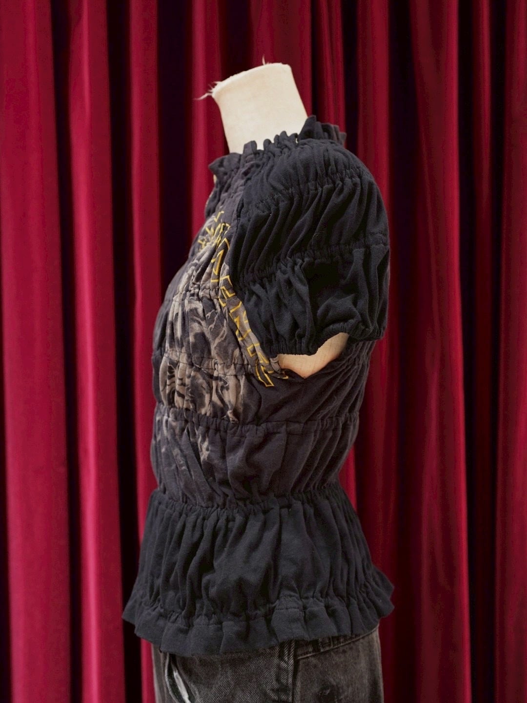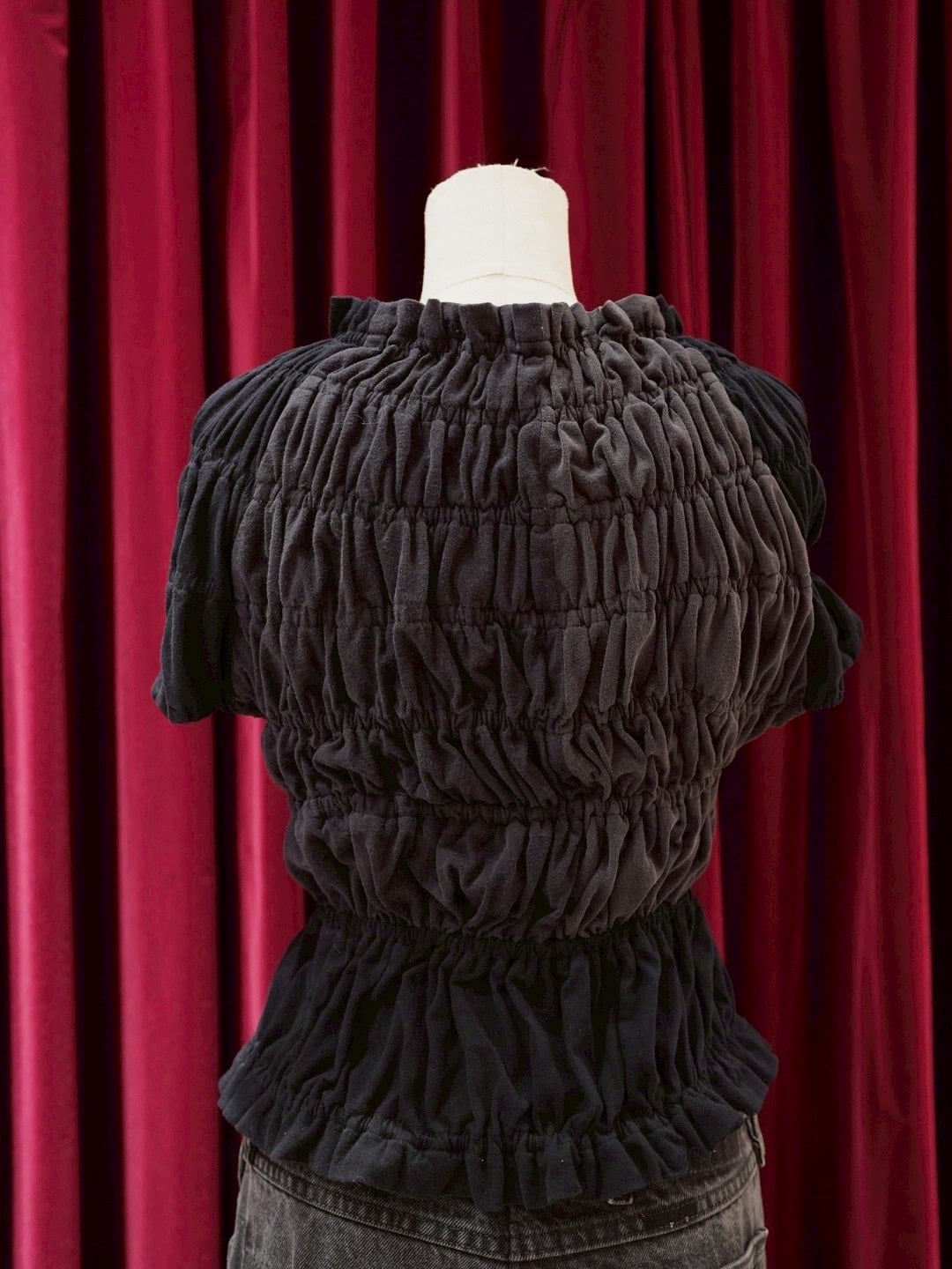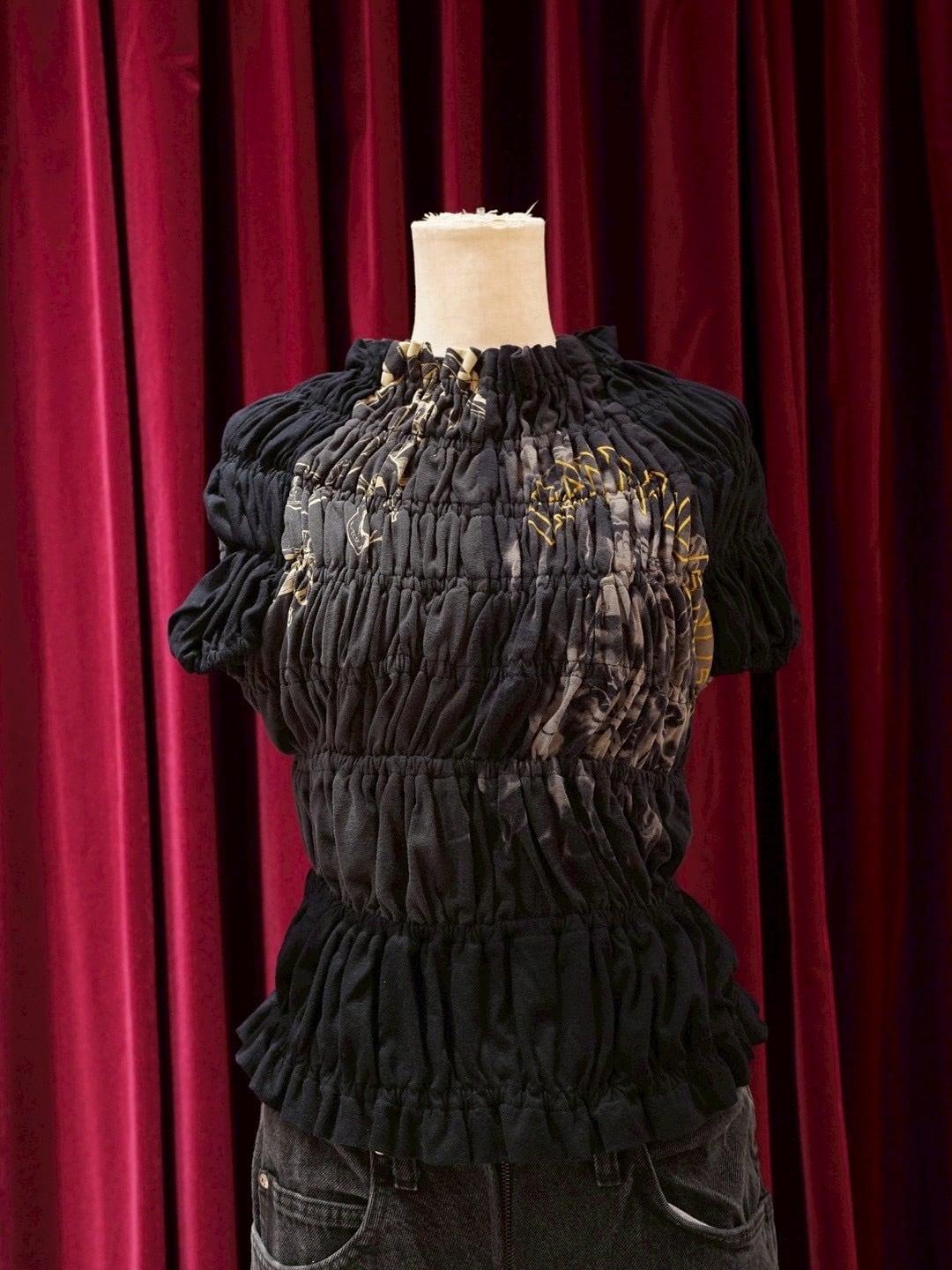 シャーリングをたっぷり寄せて仕立てたリメイクトップス。