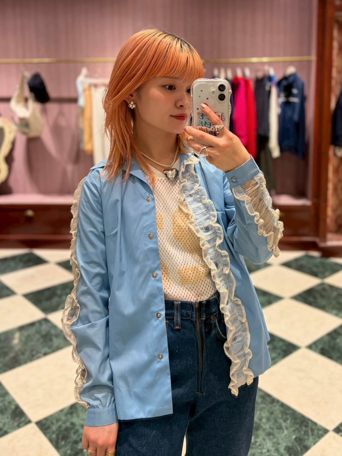 淡いサックスカラーが目を惹く、フリルデザインのシャツ。