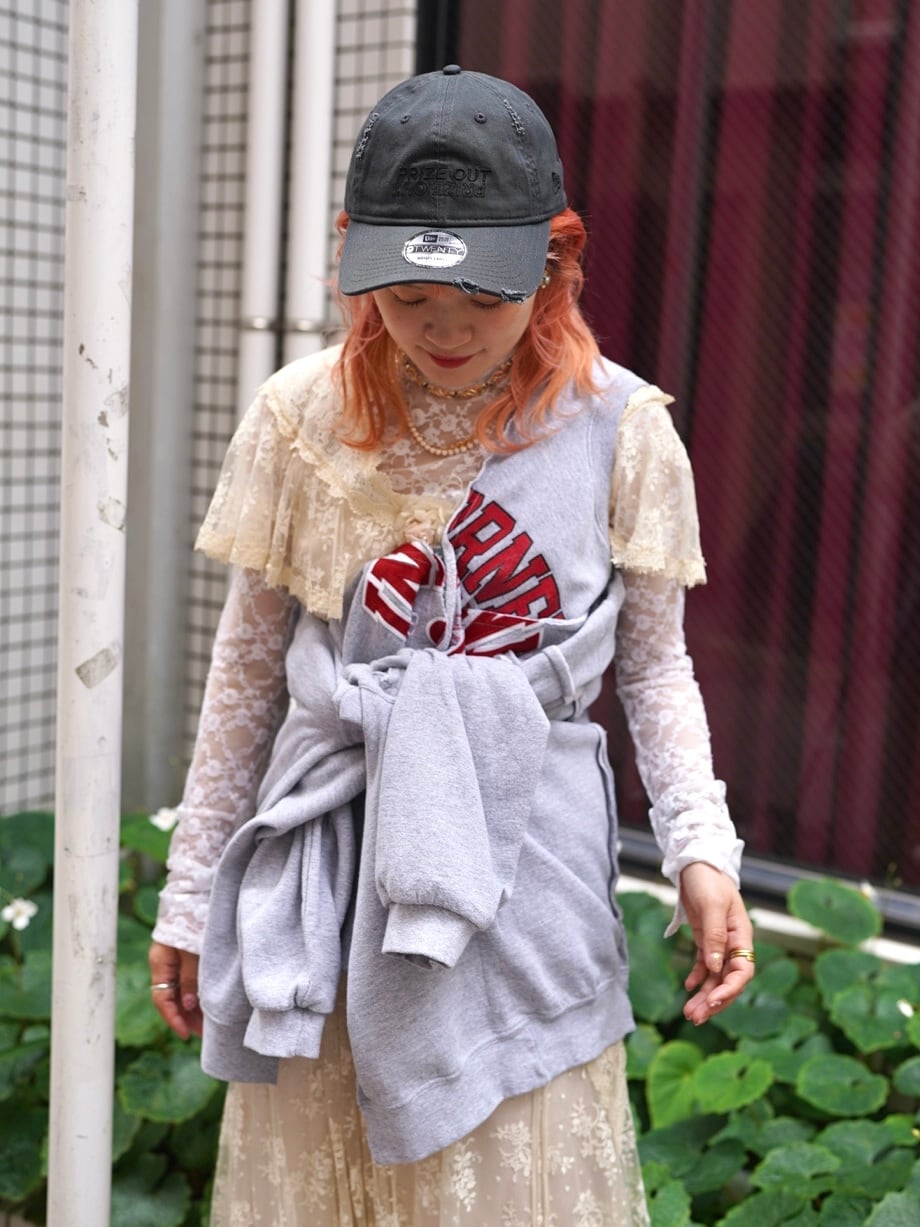 →インナーを見せたレイヤードスタイルや肌見せでヘルシーに。