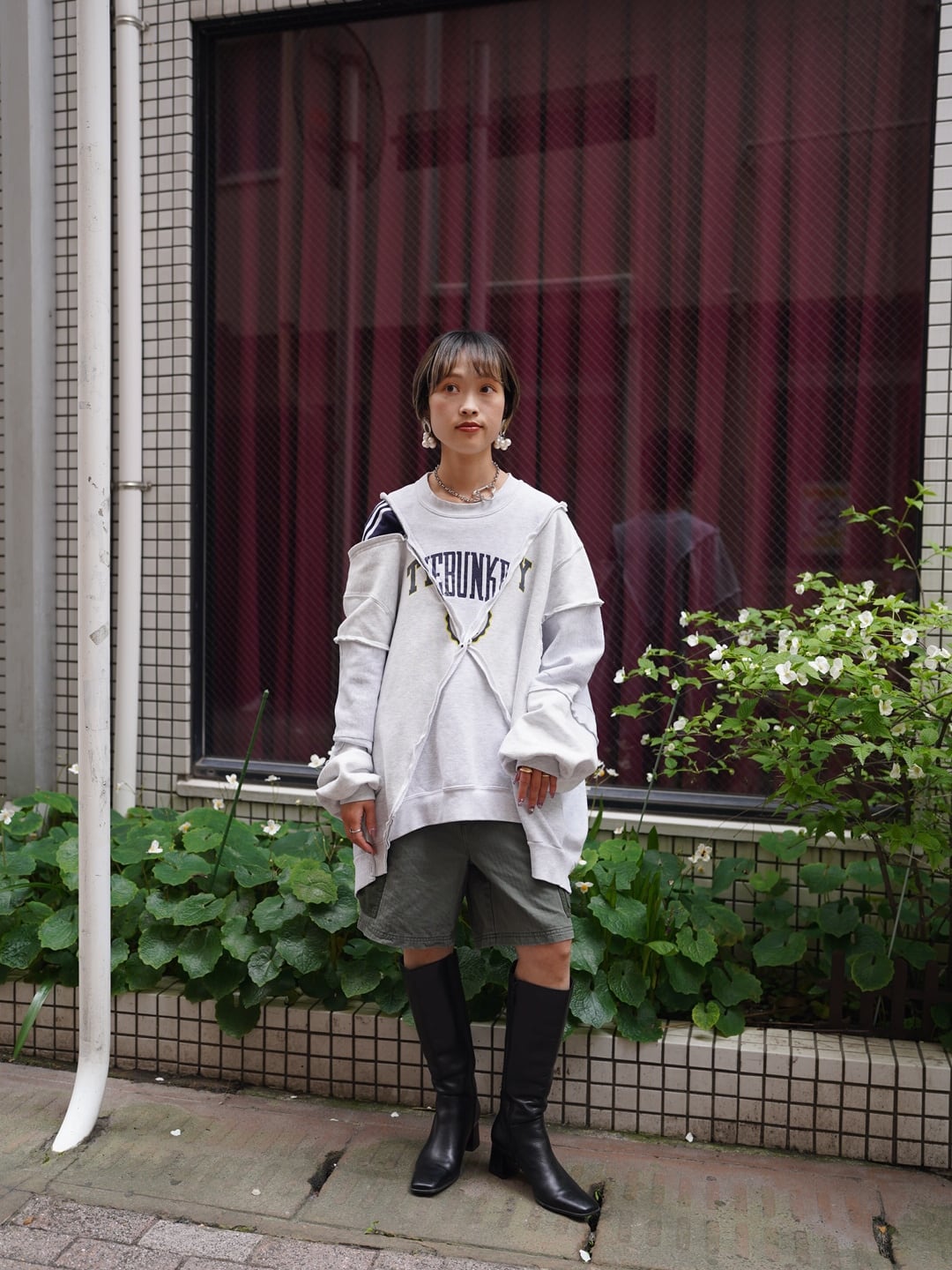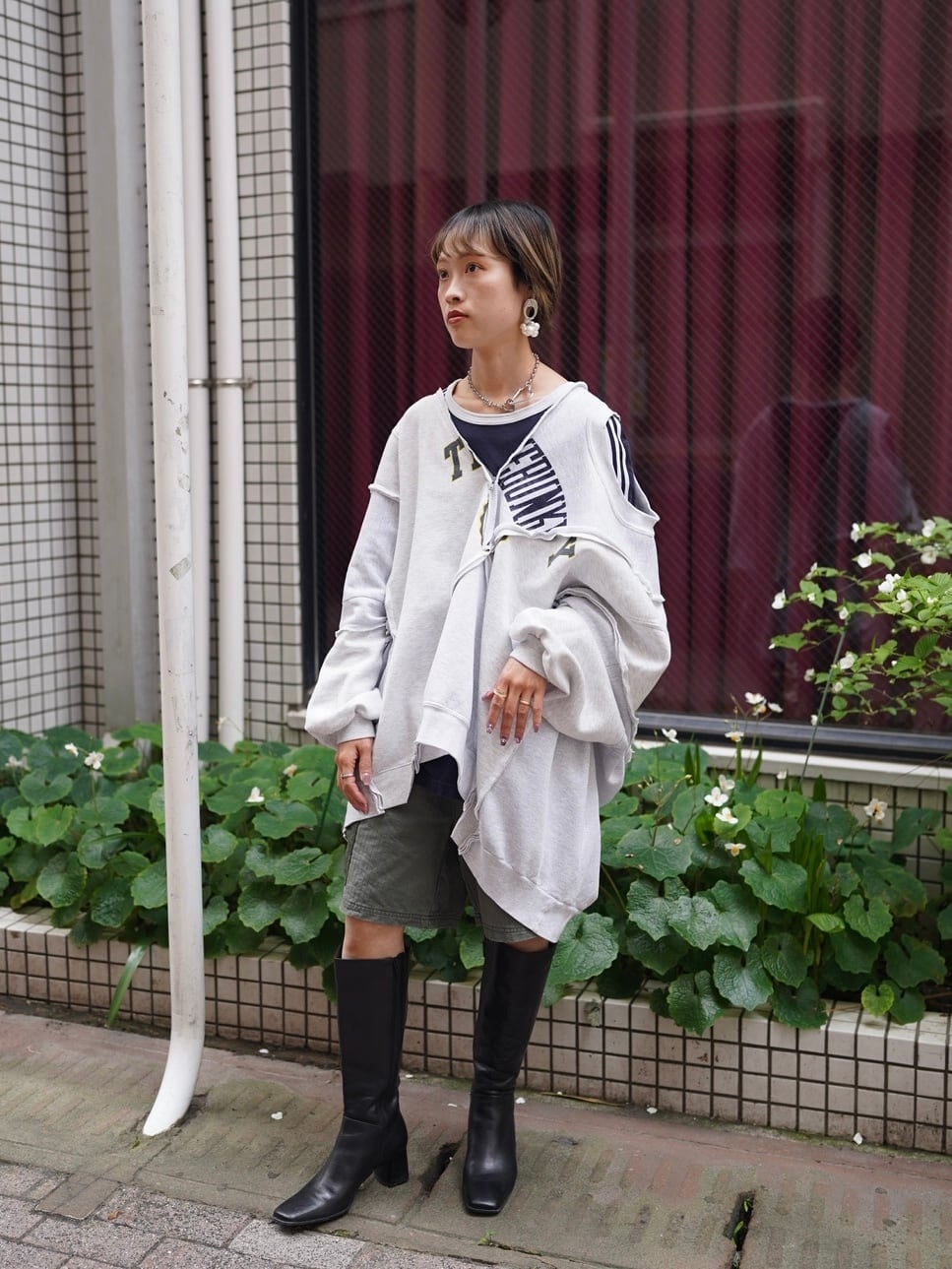 →袖をフロントで巻いて、こなれ感のある着こなしに