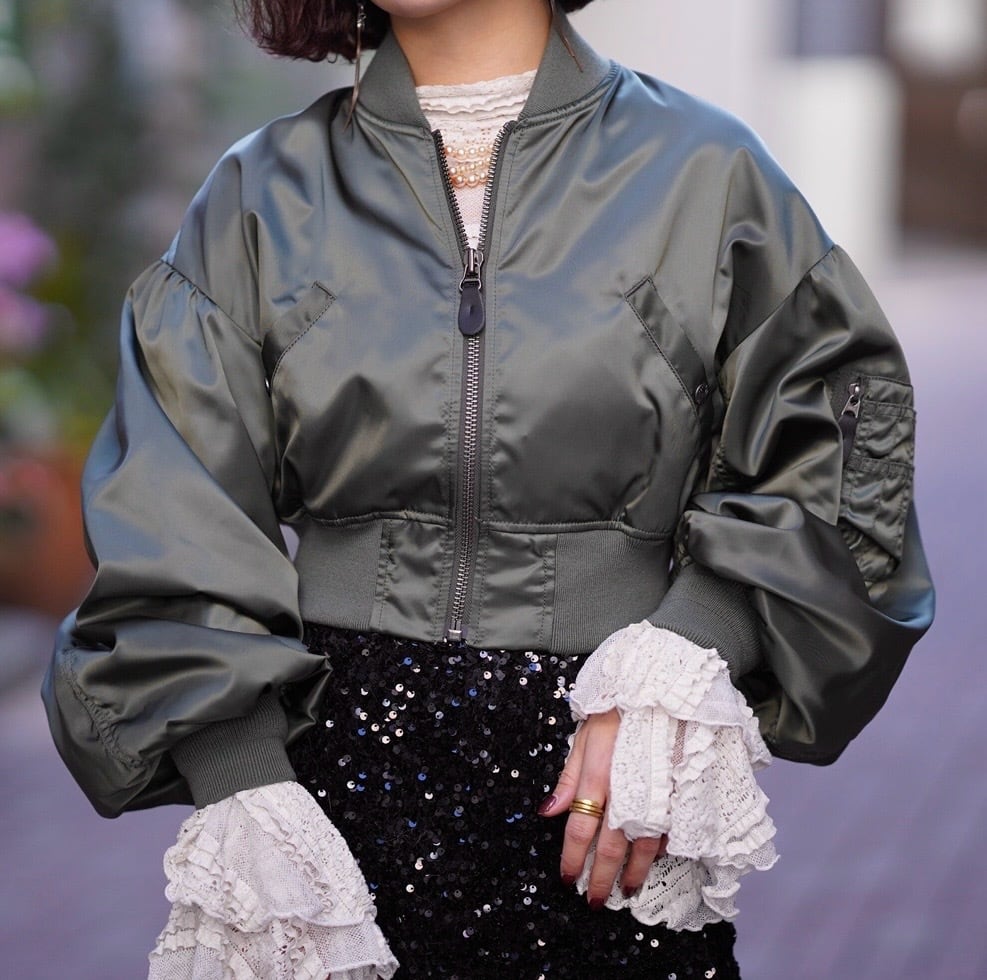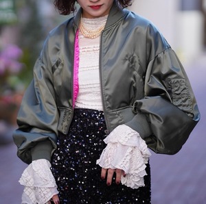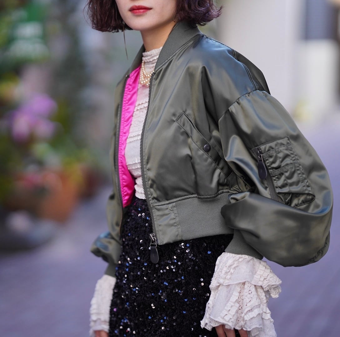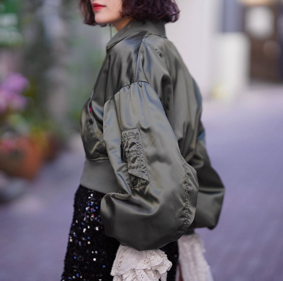 フライトジャケットL-2Bタイプをベースに<RHODOLIRION>らしくアレンジを加えたボマージャケットです。表地はナイロン100%のツイル生地を採用し、中綿はなく、ライニングには光沢があり、体のスベリの良いポリエステルサテンを使用しました。本来のジャケットのもつ特徴であるゆったりとしたシルエットは踏襲しつつも、着丈を短くすることでどんなアイテムもバランスが取りやすいフライトジャケットです。