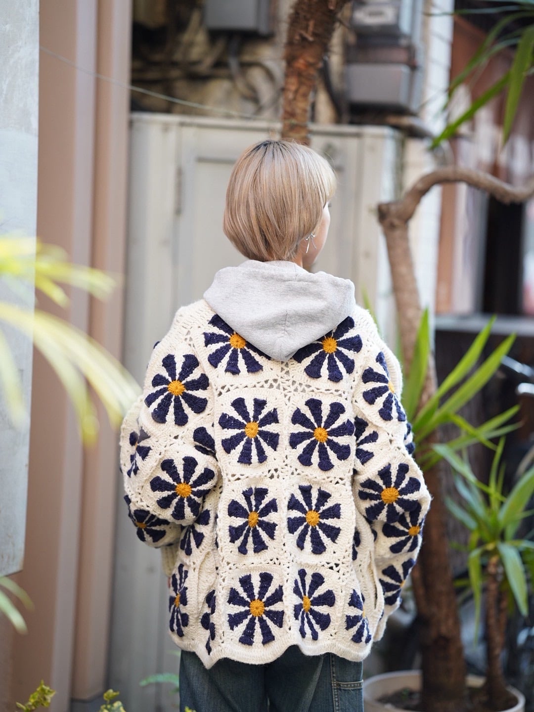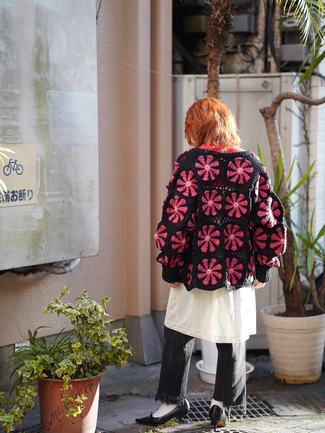 クロシェ編みでポップなフラワーモチーフが目を引くアイテム。