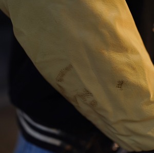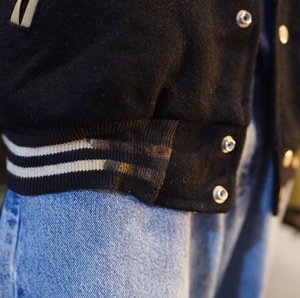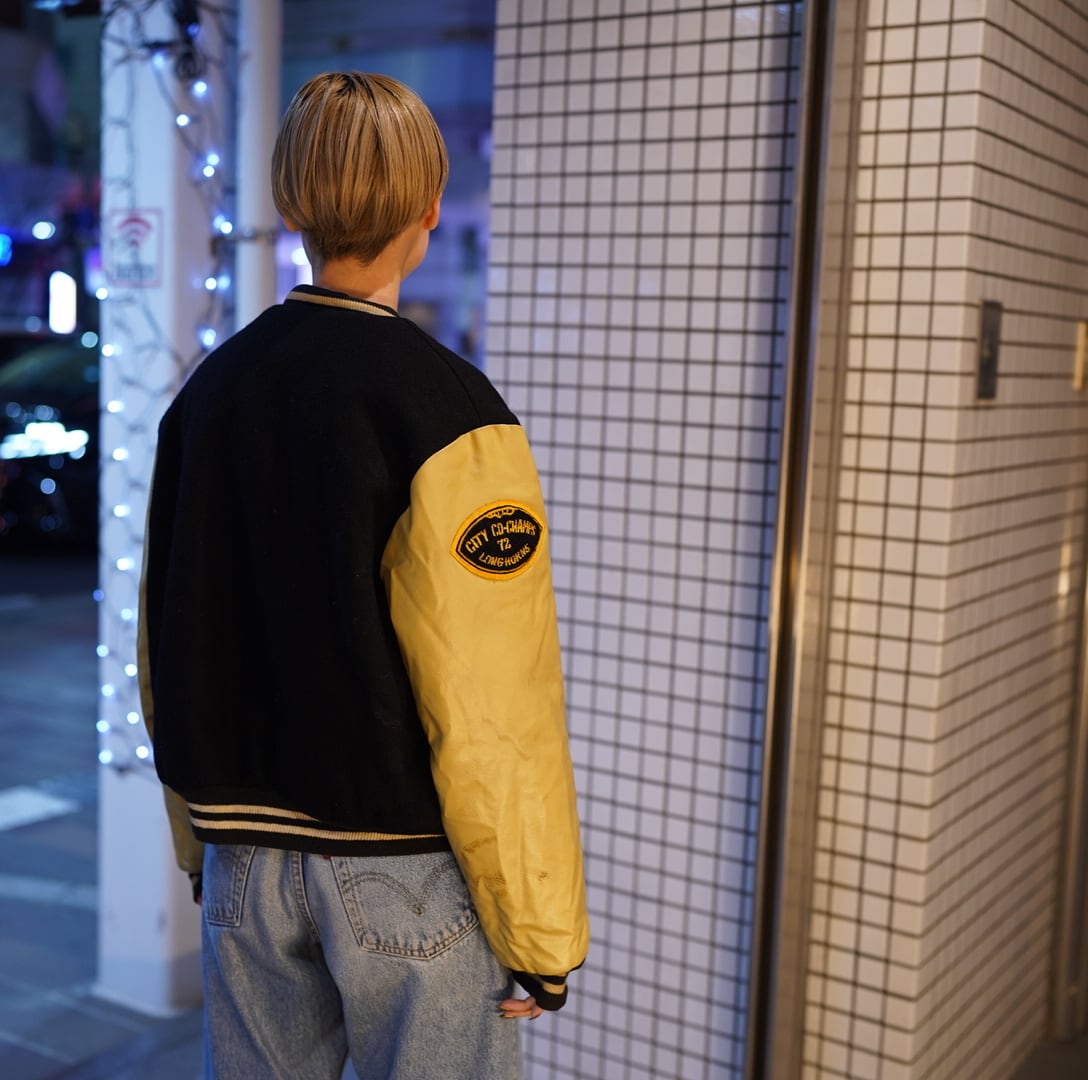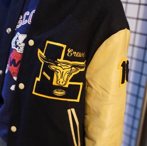大きめのワッペンが胸元、両袖の肩付近についているのがポイント。