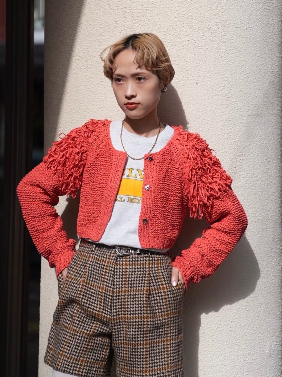 ショルダー部分のフリンジが華やかなショートカーディガンです。素材はポリエステル/ナイロンのリボンテープヤーンを採用しています。凸凹感のあるテープヤーンをふんわりと編み上げることで独特な風合いを醸し出し、清涼感のあるニットに仕上がりました。コンパクトな丈感なのでインナー次第で様々なレイヤリングが楽しめます。ワイドパンツなどボリュームのあるボトムスと相性が良くおすすめです。
