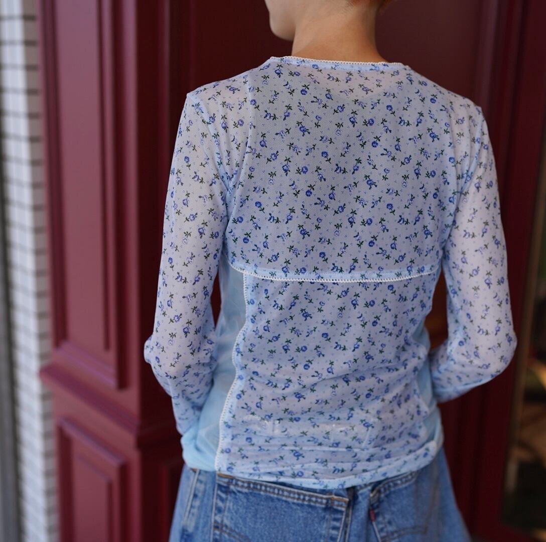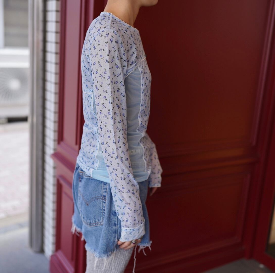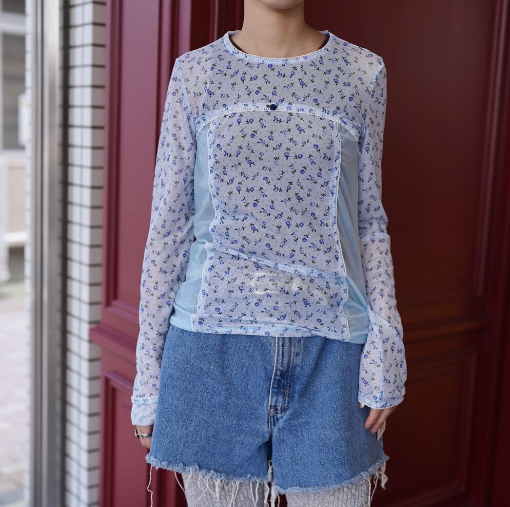 ・シアー感溢れるメッシュに施した小花柄プリントがスタイリングのポイントになるシアートップス。